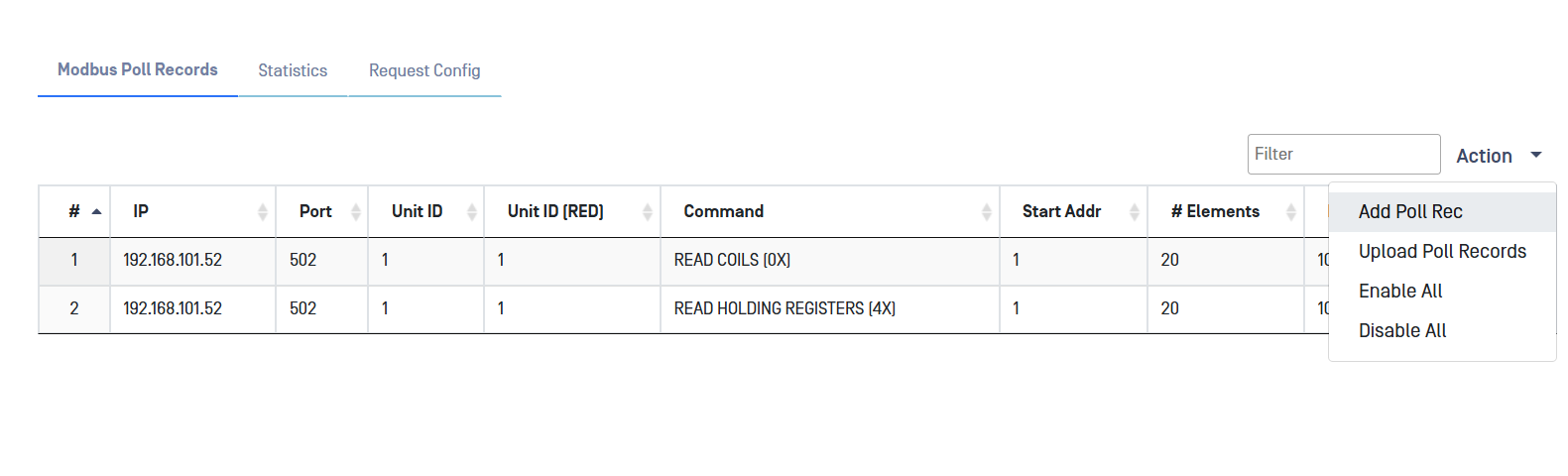- Go to Modbus menu deploy Action button and select Add Poll Rec.