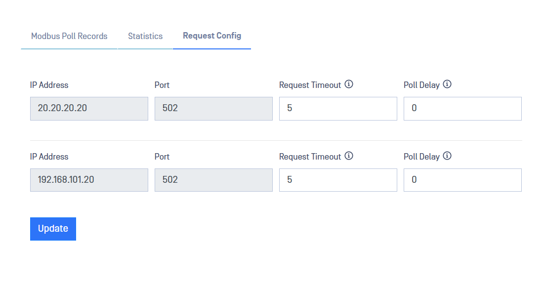 - Poll Delay: Poll delay in milliseconds per IP and Port. A value greater than 0 will overwrite the value of "Poll Rate" of every poll record with the same IP and Port. Leave 0 to honor each "Poll Rate" value in Modbus poll records. Default 0 (or 1,000 for non-0 value), valid range 10 - 30,000.