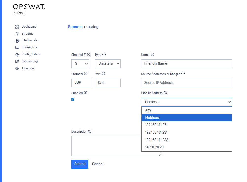 - Type: Type of stream being tracked. In MetaDefender Optical Diode Unilateral is the only option available