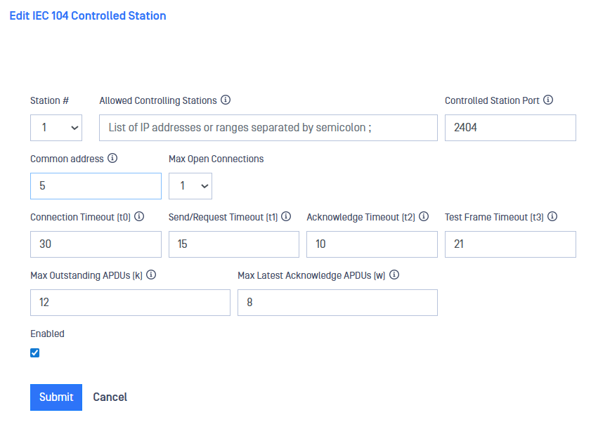 - Enabled: IEC 104 Connector can be enabled/disabled using this checkbox