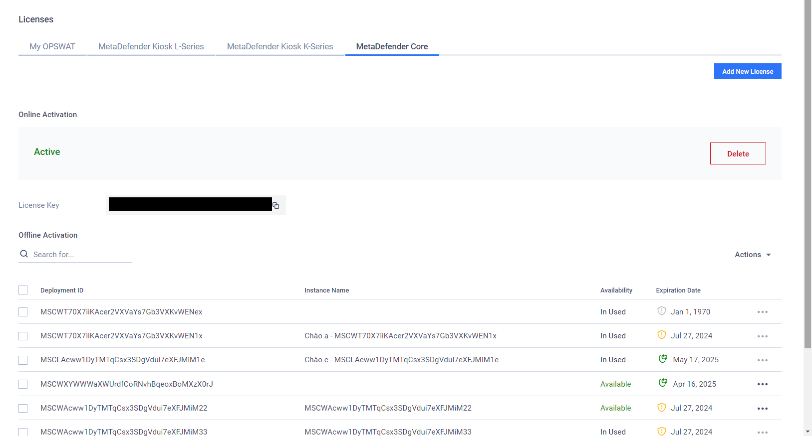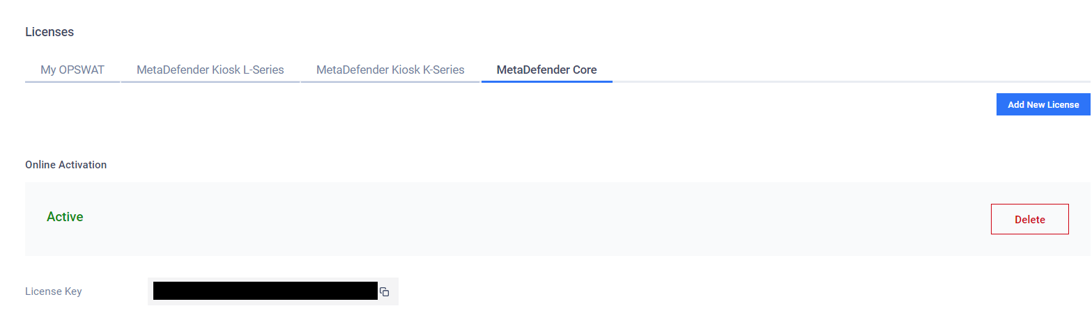 To add a license, click Add New License. In My OPSWAT On-premises, you will be asked to choose between Online Activation or Offline Activation. Please refer to the corresponding sections below to continue.