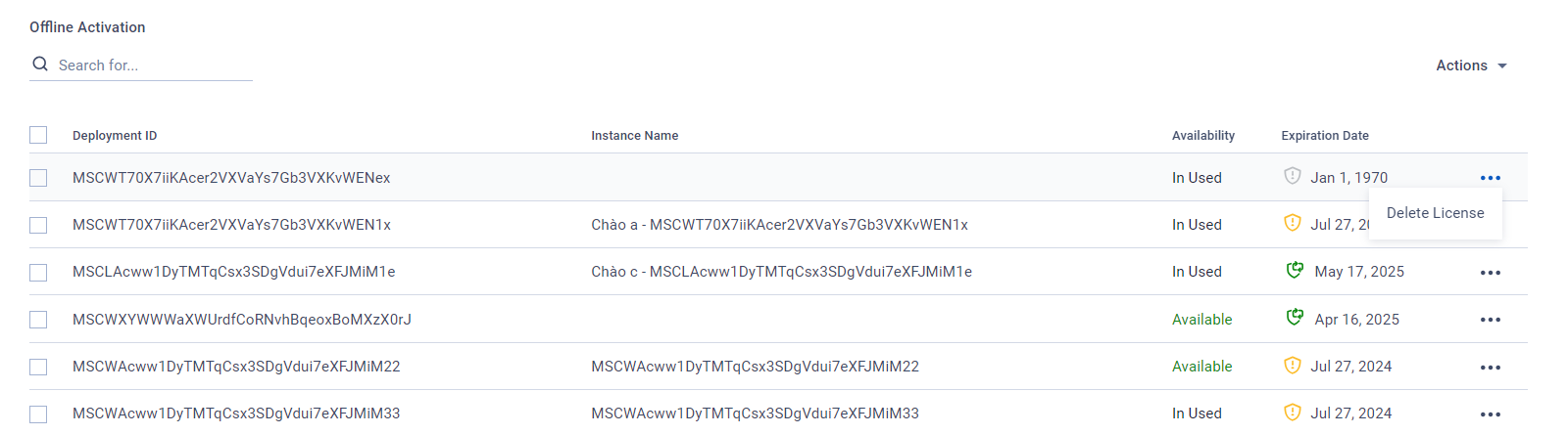 To remove an offline license, click Delete License from the corresponding entry's drop-down menu. Please note that licenses with the In Use status cannot be removed.