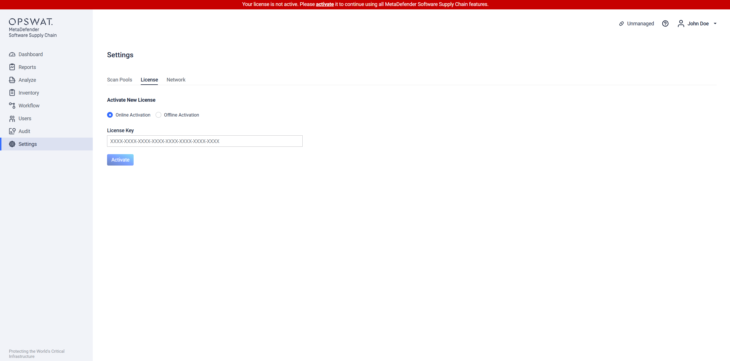 A license can be activated online, based on a license key, or offline using a file previously generated on My OPSWAT. These options can be found under the 'Settings' menu, in the 'License' tab entry.