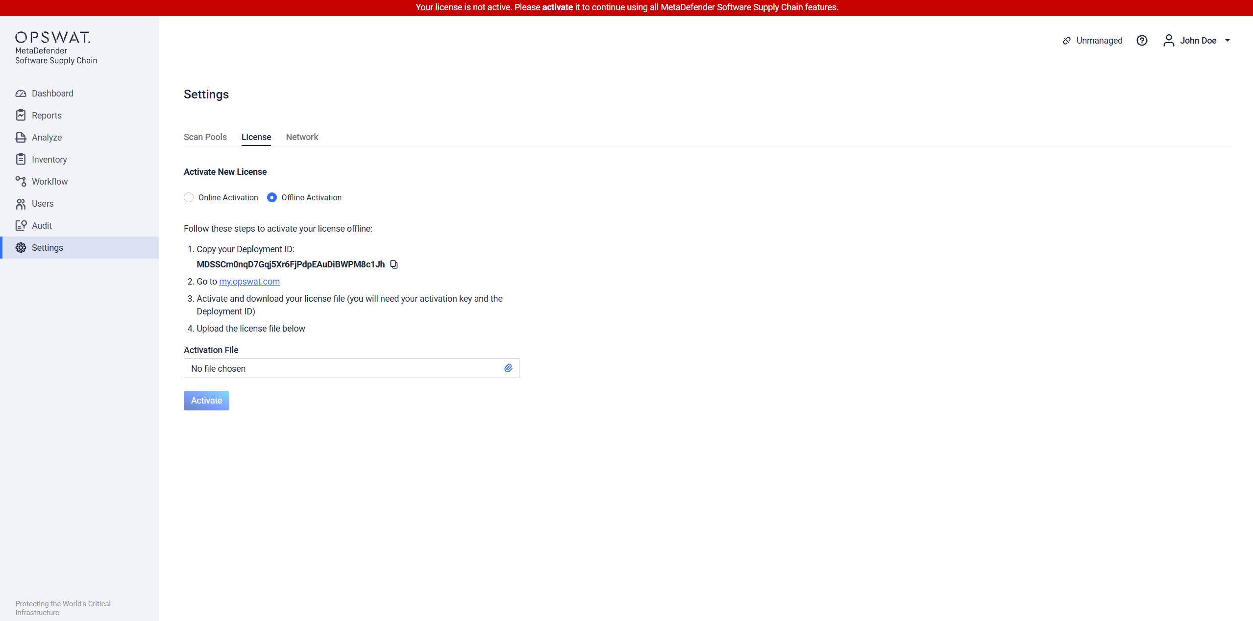 - Once the file is downloaded, upload it to MetaDefender Software Supply Chain to complete the activation process.