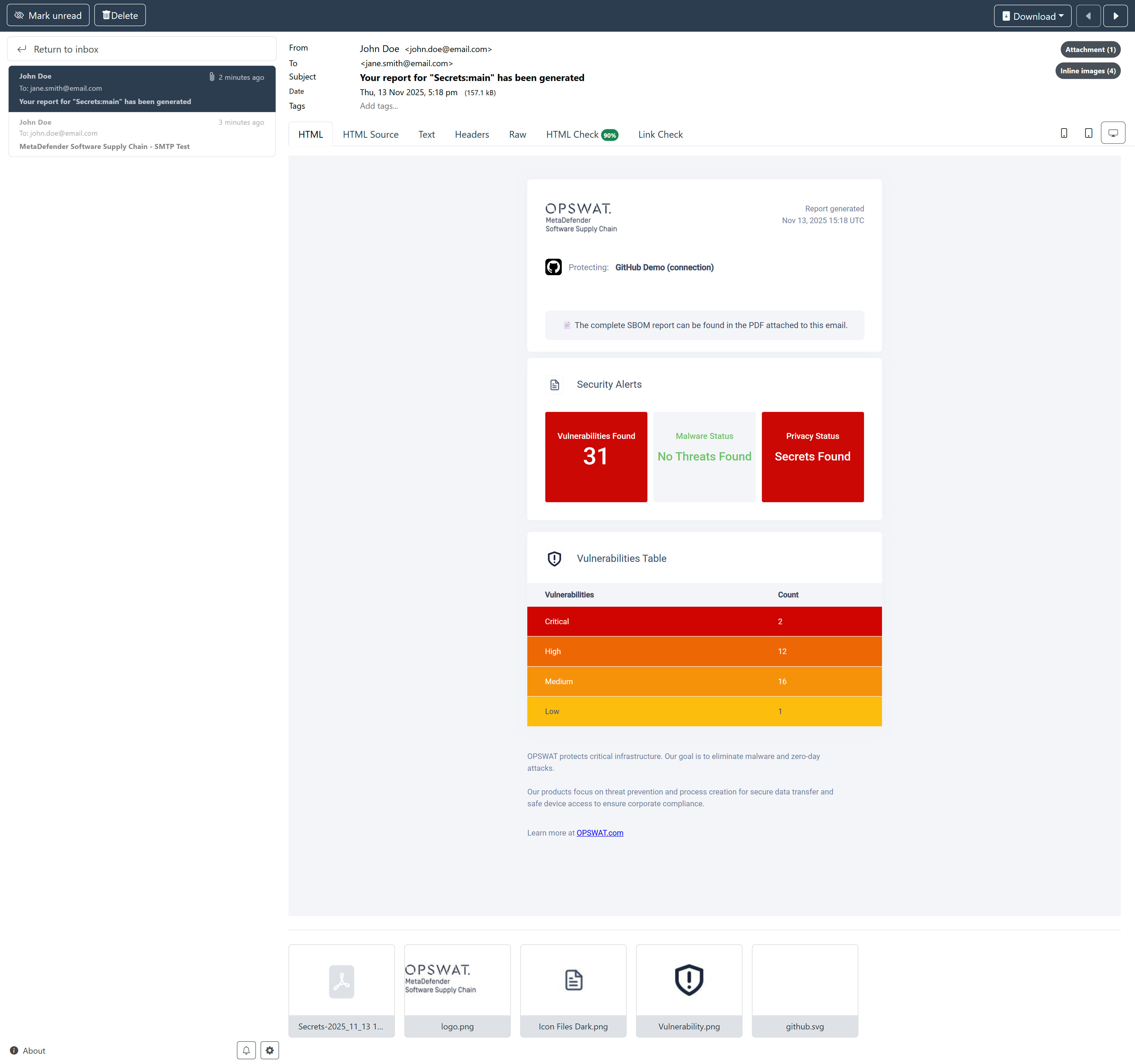 Workflow can be configured to send email notifications as a remediaton for scan events via SMTP email to a list of email addresses. This can be done if MetaDefender Software Supply Chain has access to an SMTP server.