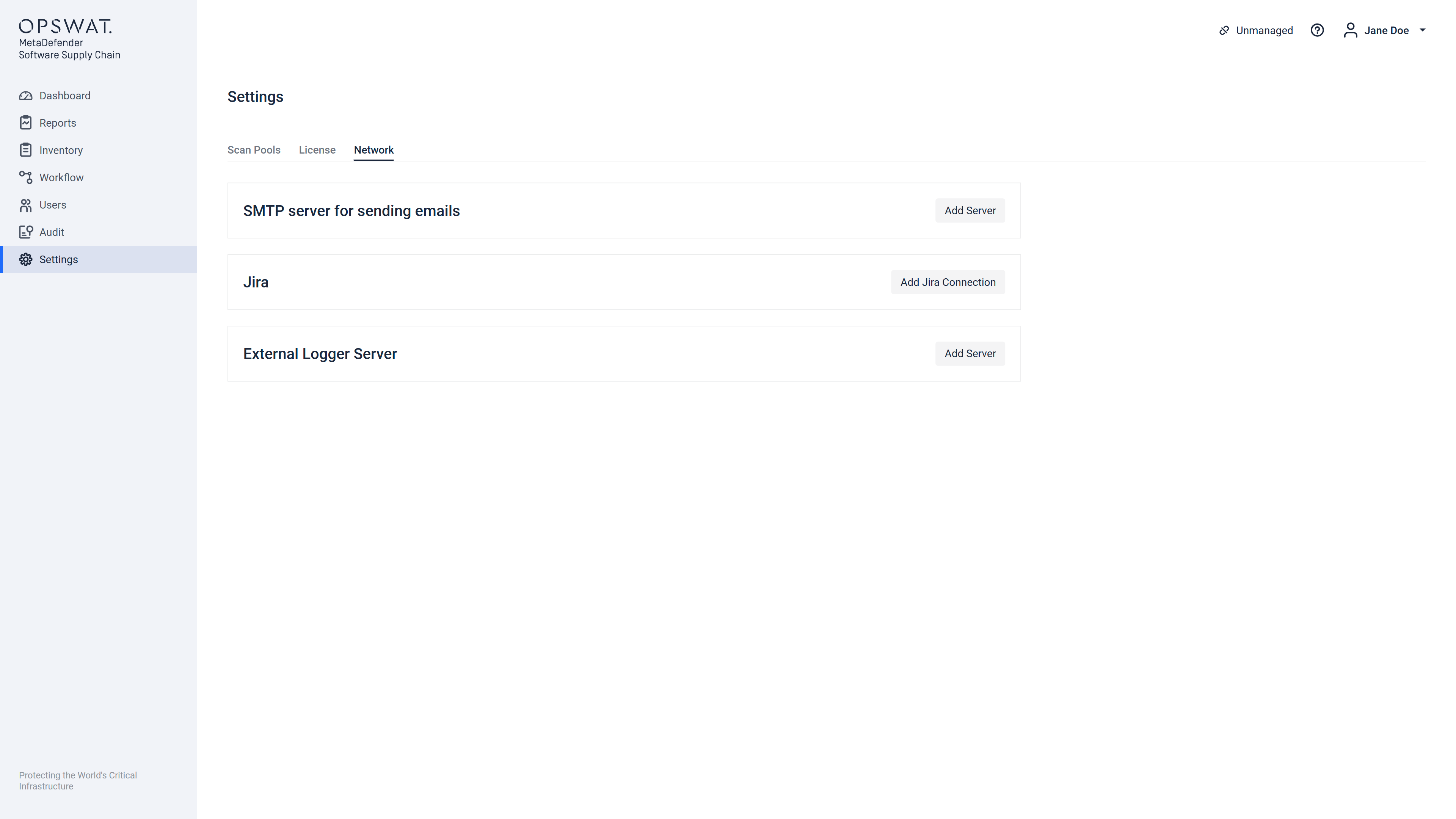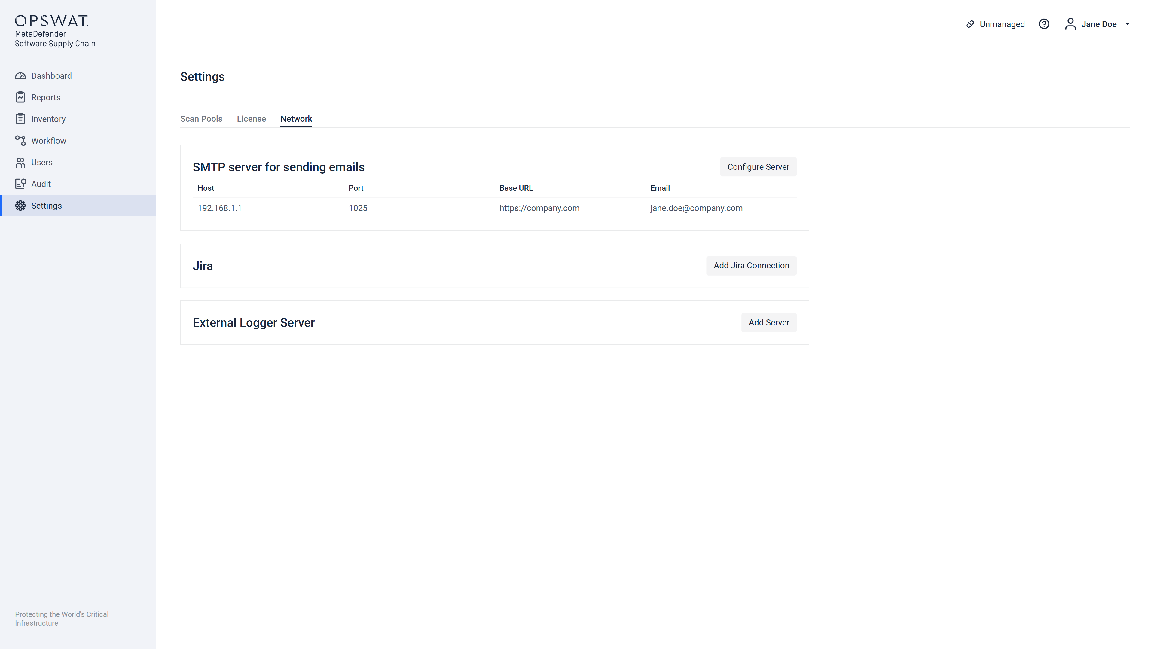 To configure a SMTP server that can be used to send notification emails, navigate to 'Settings' menu, and go to the 'Network' tab: