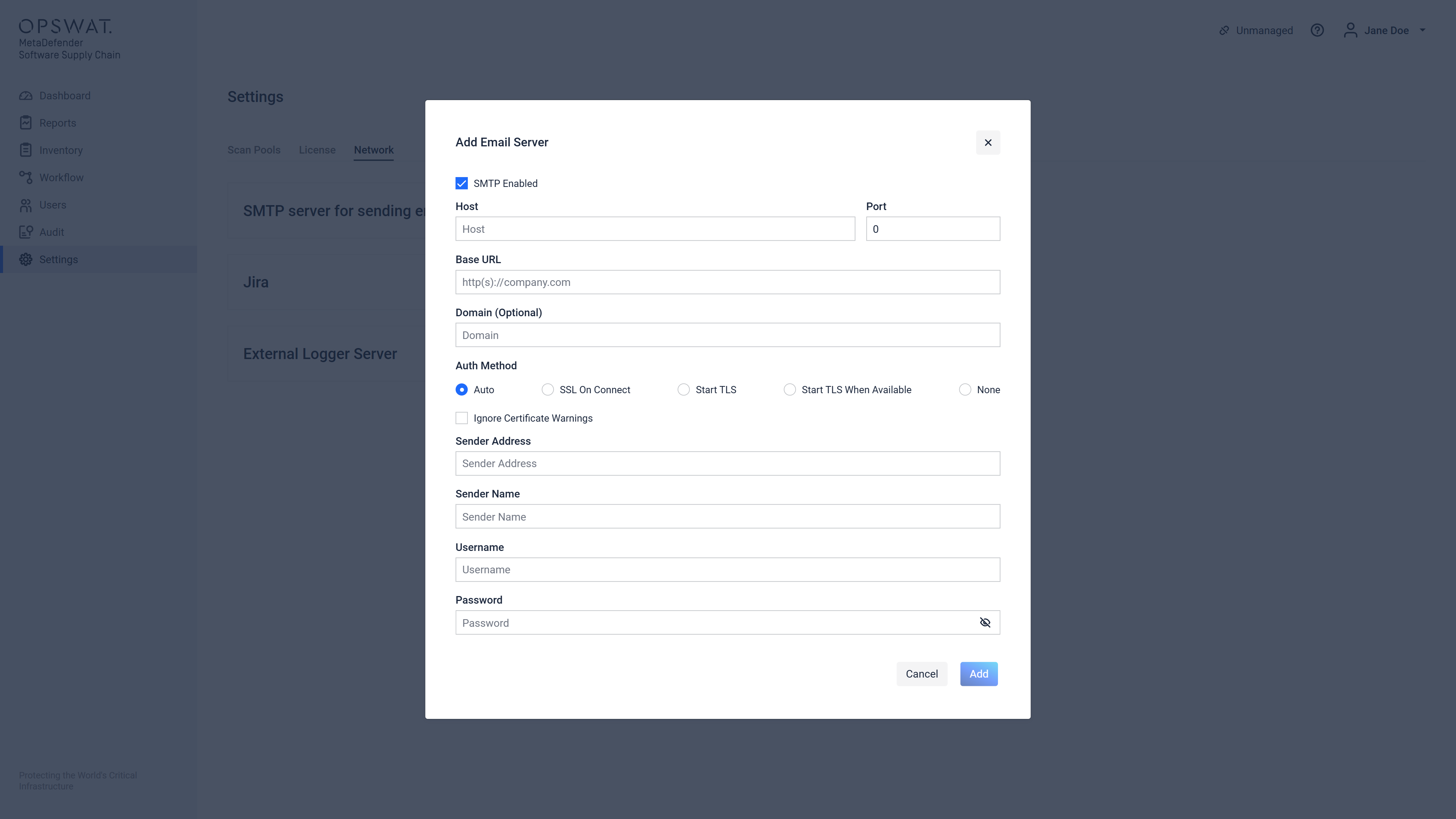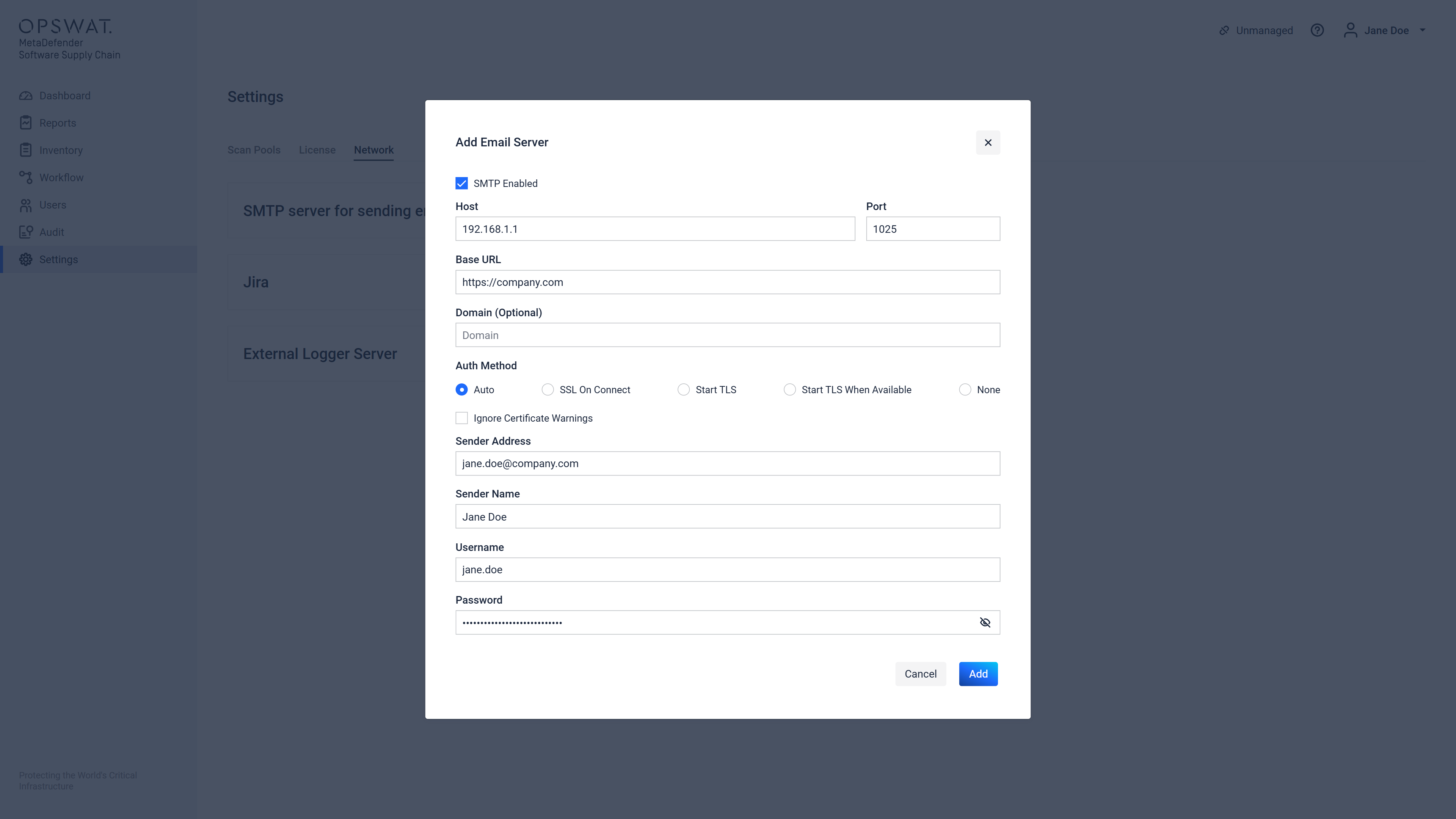 Click on the "Add" button, MetaDefender Software Supply Chain will test if the provided Host and Port accepts SMTP requests, and if they are accessible the configuration will be saved. And the introduced SMTP server will be listed: