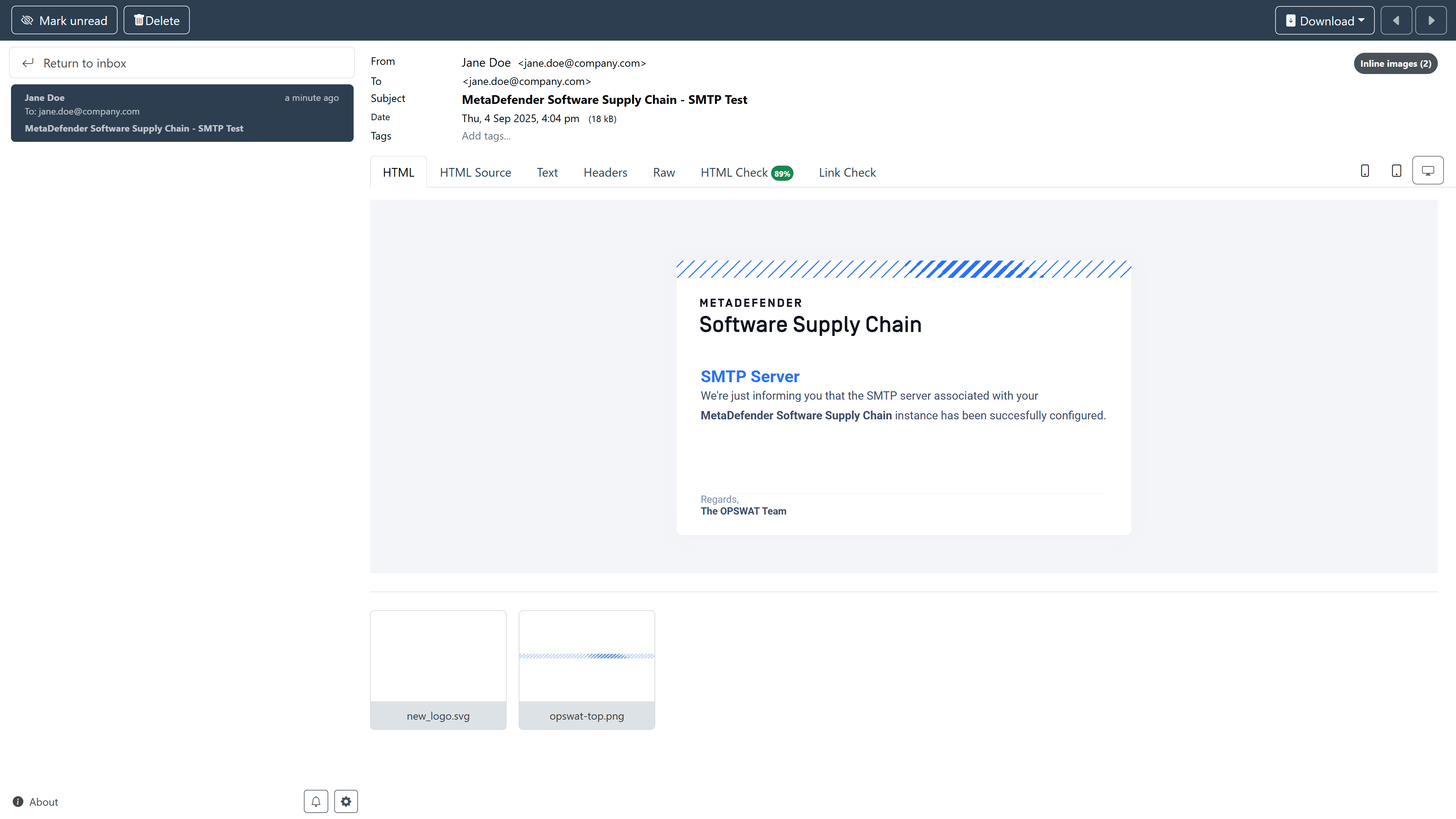 After a successful registration of a SMTP server, a test email should be received, example below: