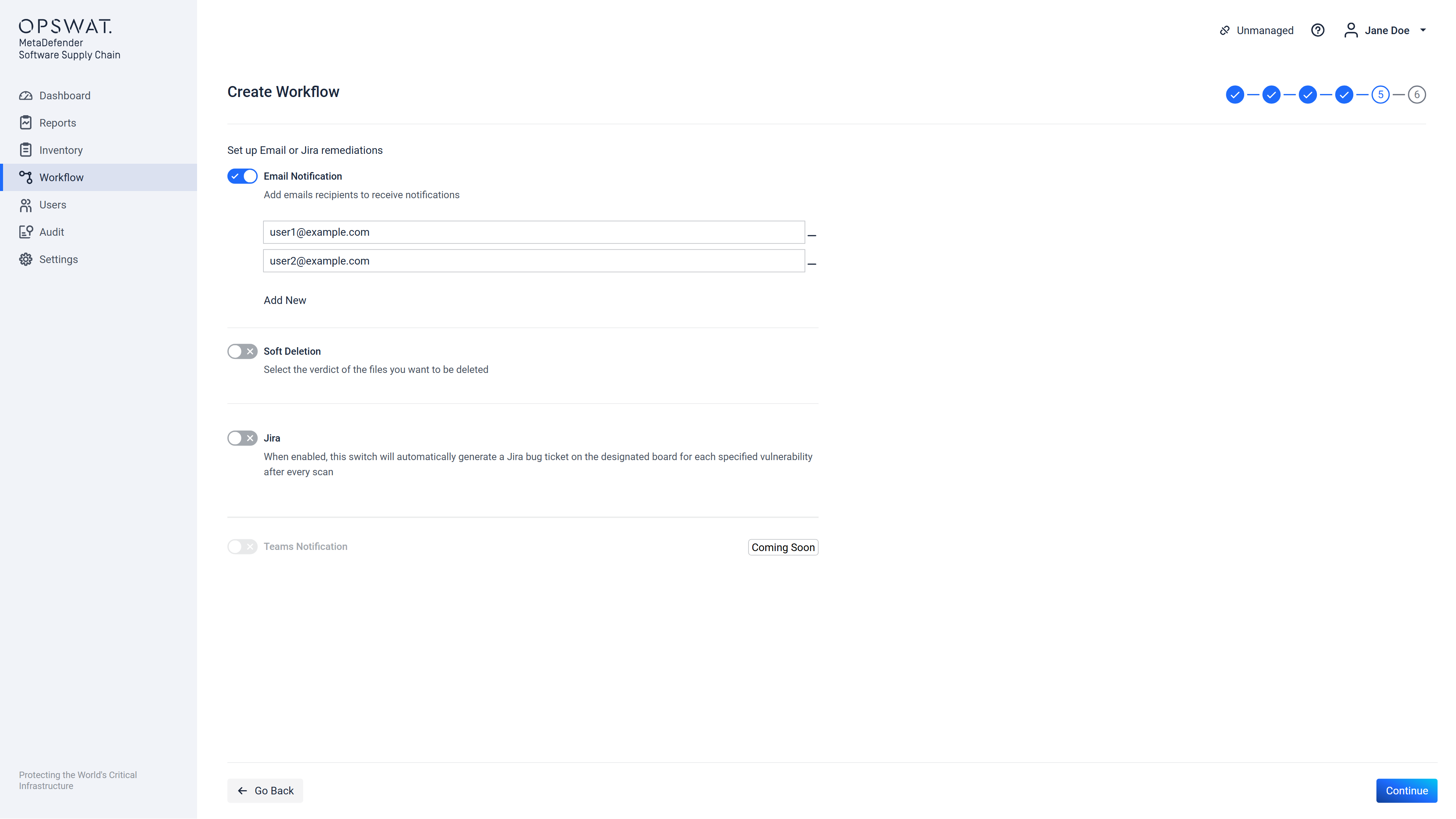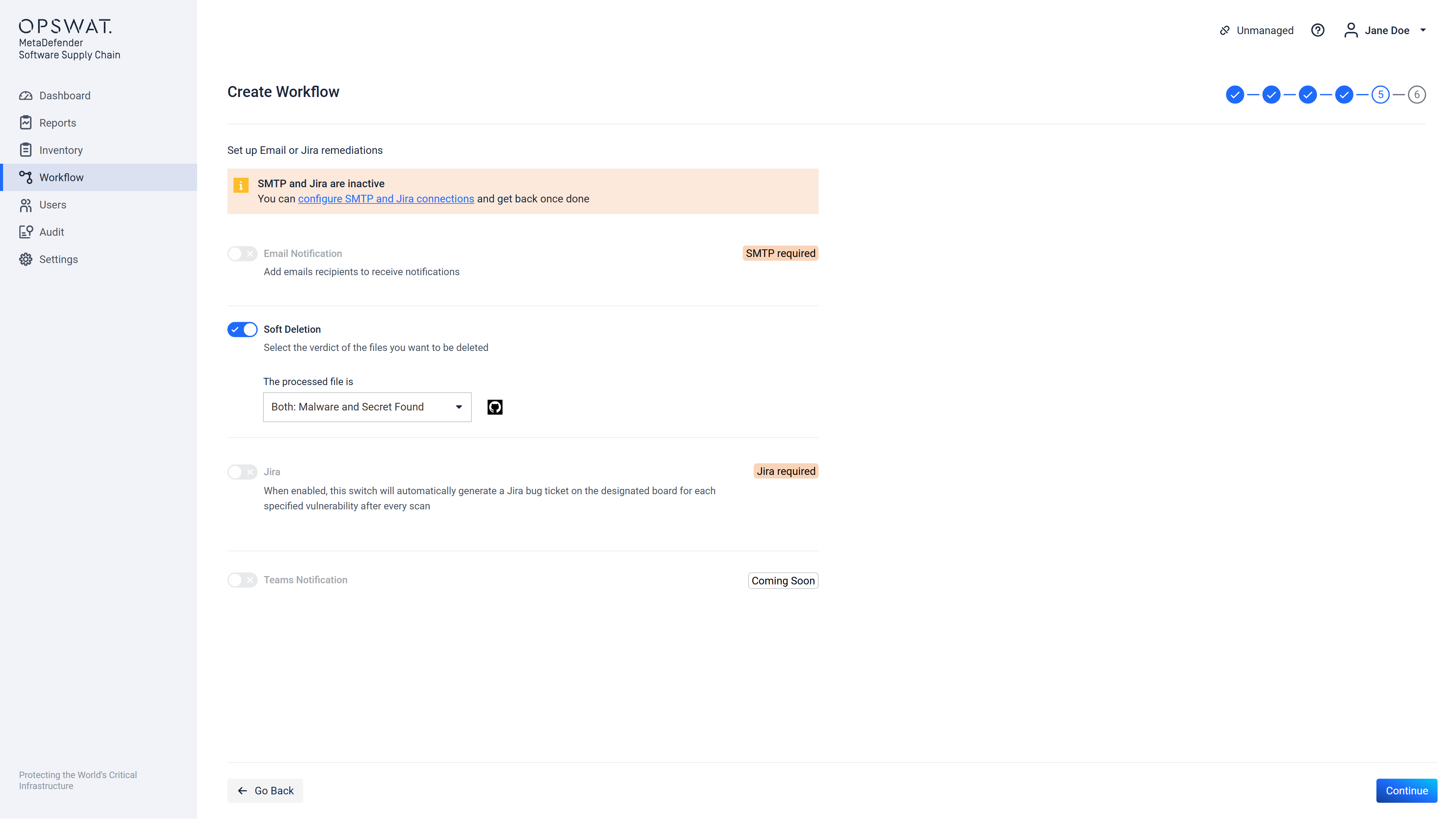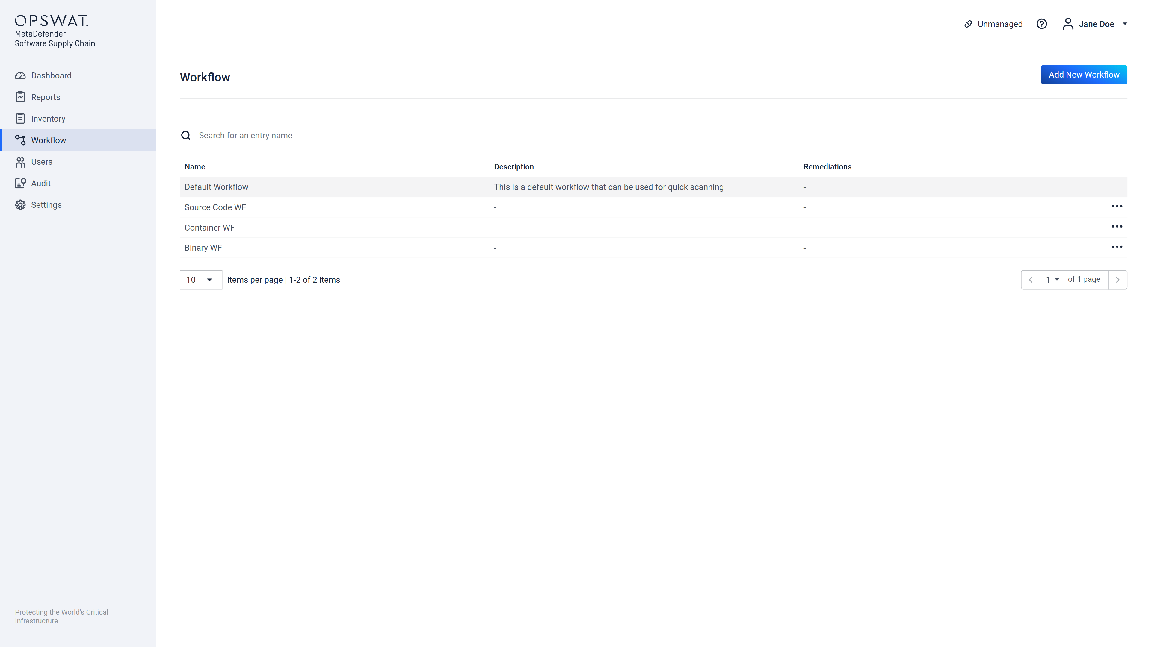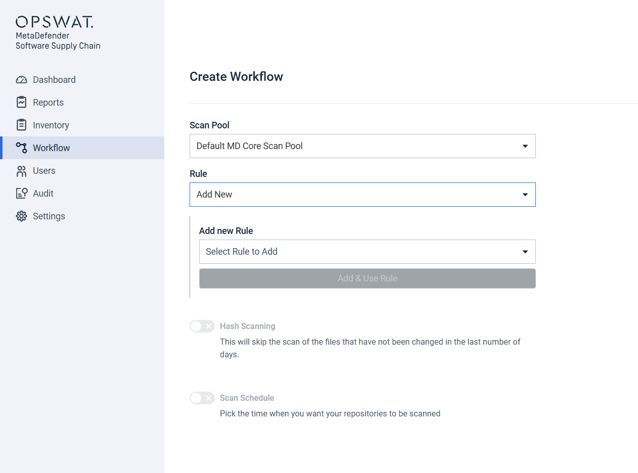 A workflow is necessary to trigger scanning operations, and it's mandatory to have one created in order to be able to use the services provided by MetaDefender Software Supply Chain.
