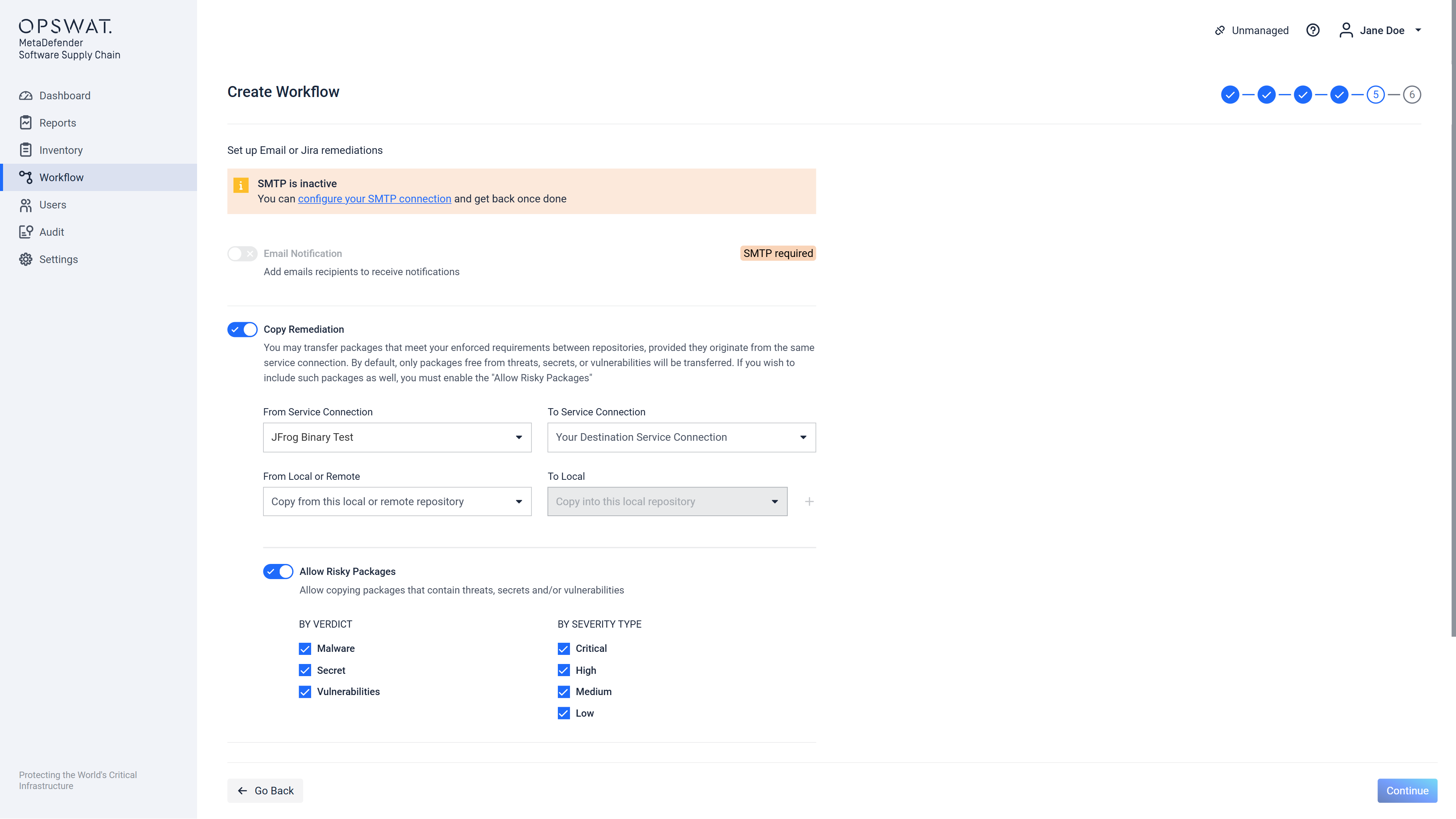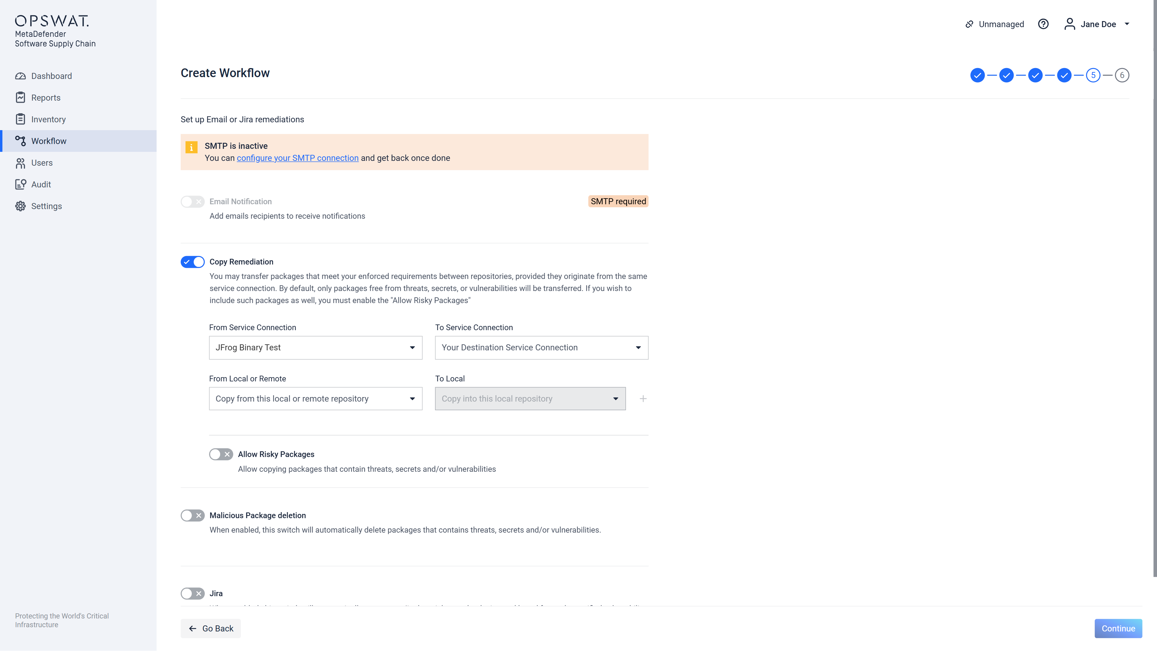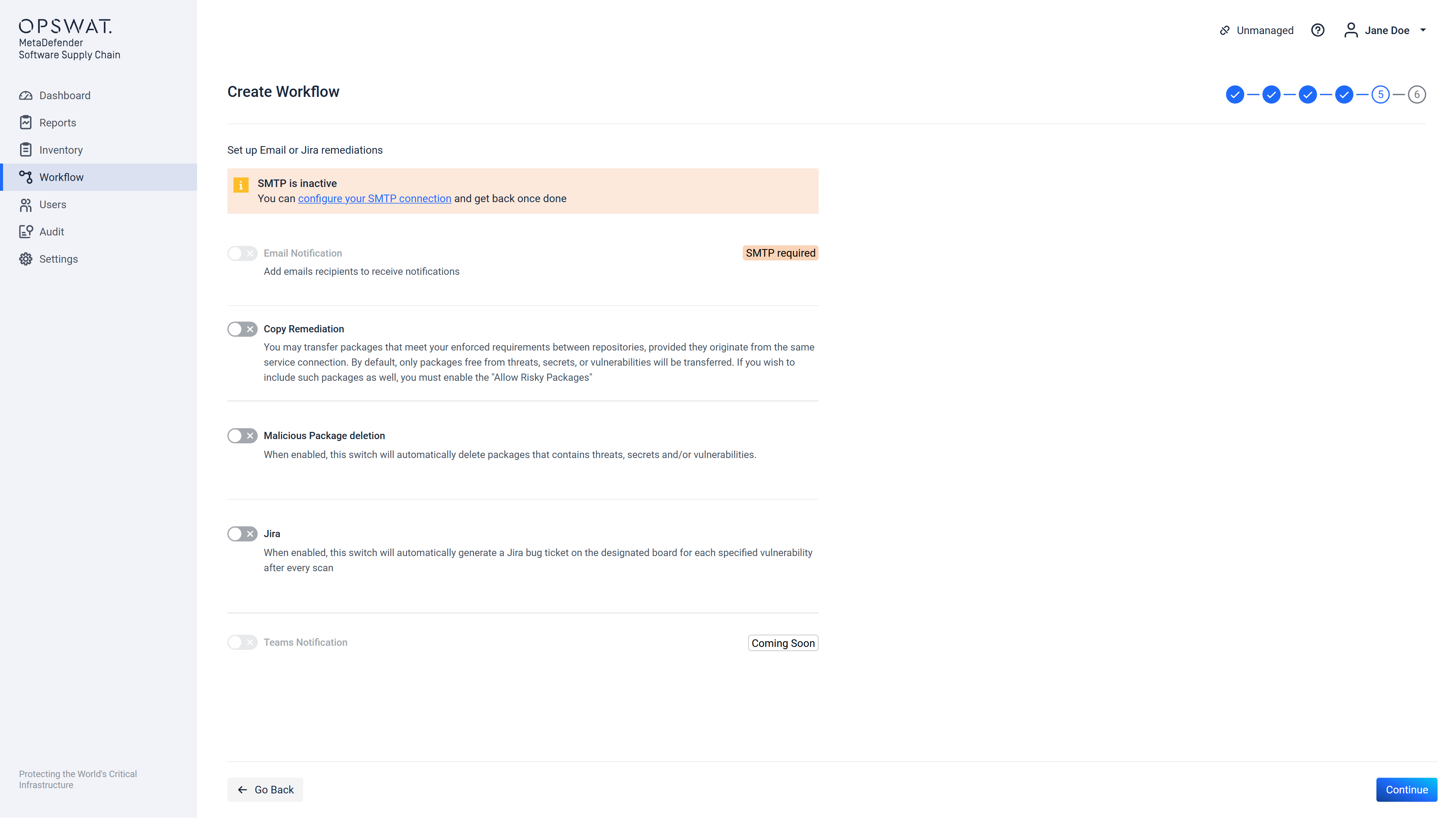 Step 5 allows configuration of remediation actions (what to do after a scan is finished). If there is no SMTP server configured that the framework can use, then on this page an error will be displayed and no email type remediations can be configured. The same applies to Jira remediation, if there is no Jira Connection added. This can be seen below: