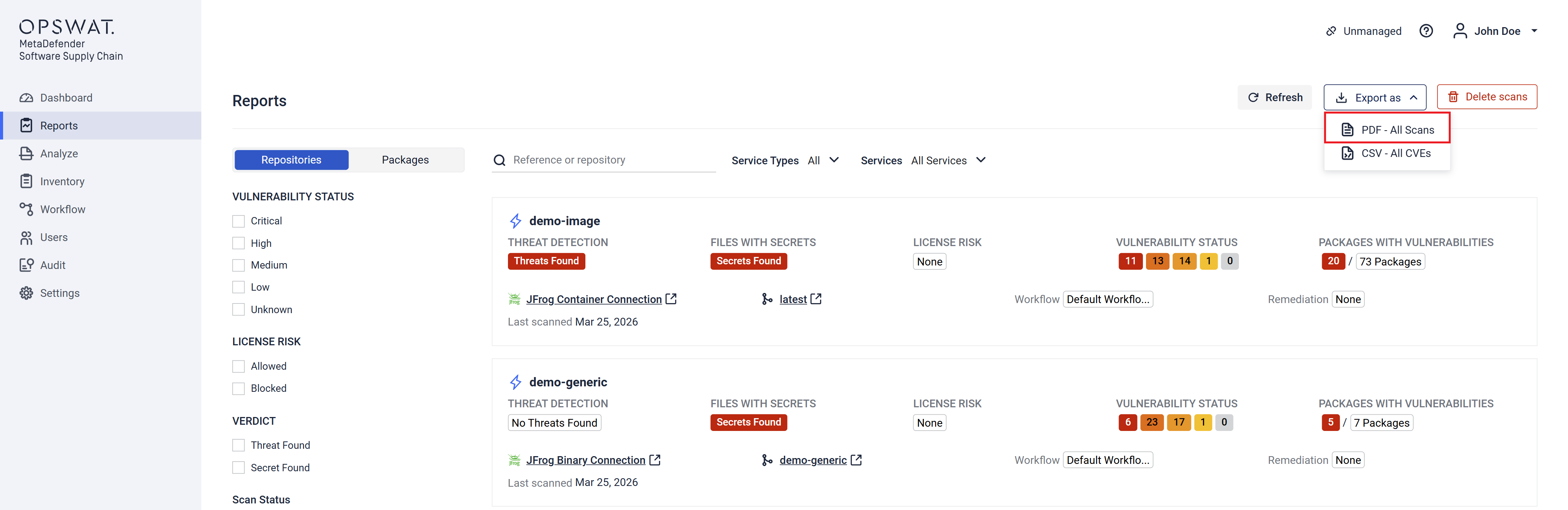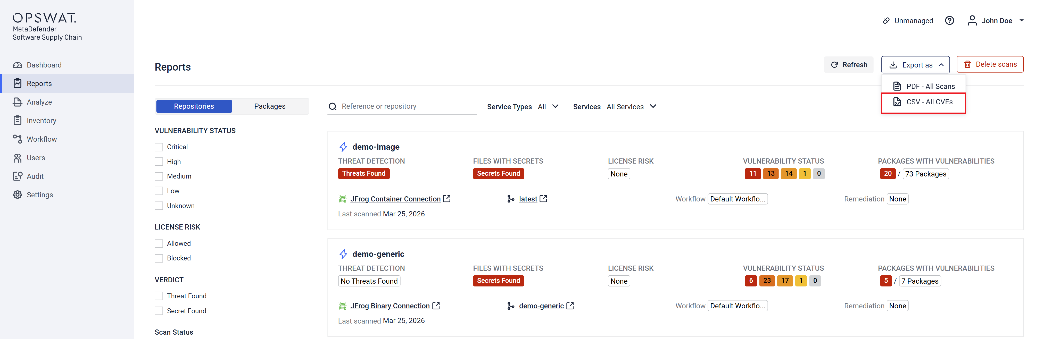 This page provides an overview of the export capabilities available in MetaDefender Software Supply Chain and how to use them to extract analysis results and related data.