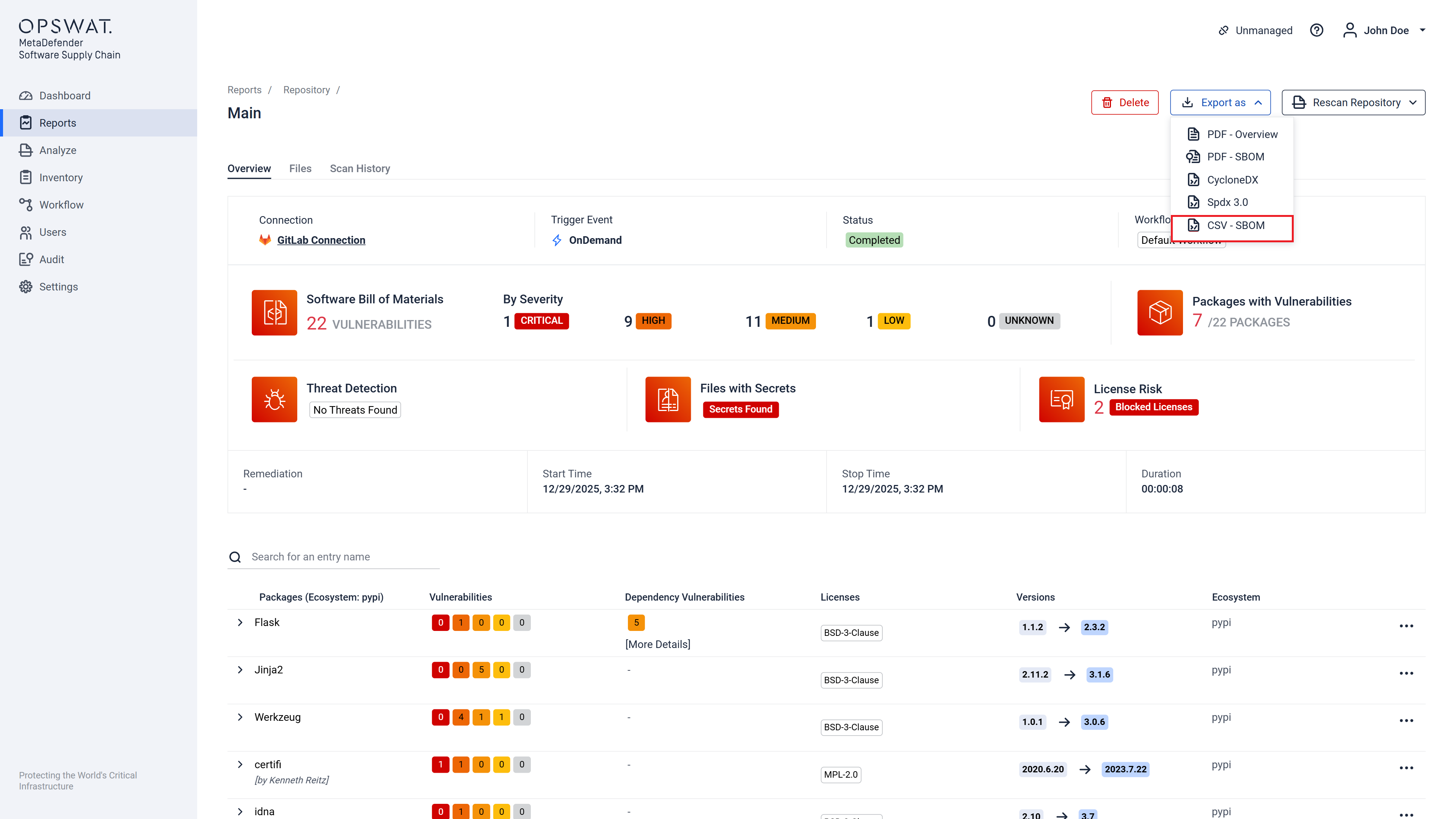 - Each file's Name and its Threat, Secret and Vulnerability Status, Hash and License Risk