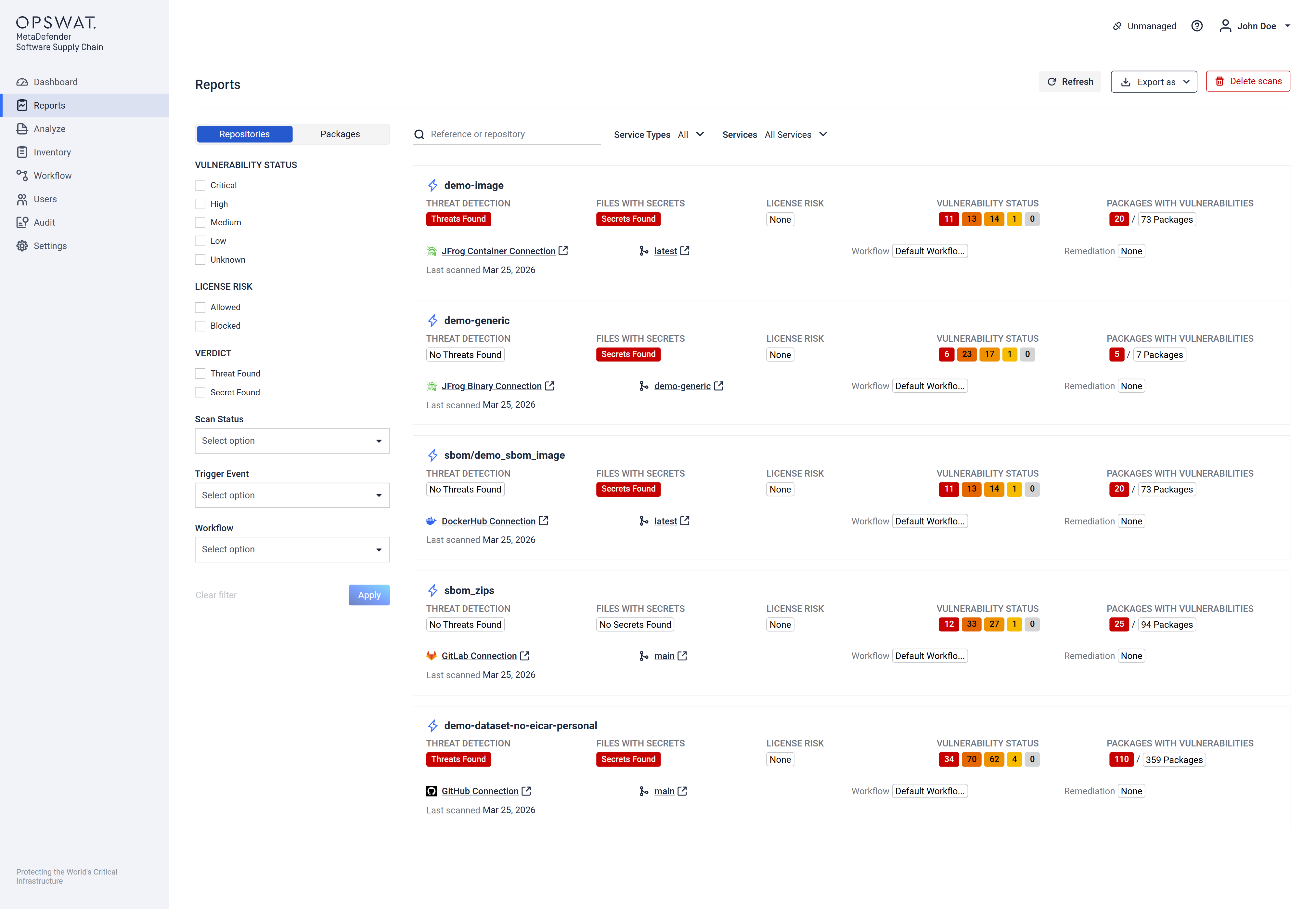 You can filter by Vulnerability Status, License Risk, Verdict, Scan Status, Trigger Event and Workflow, all from the left side filters.
