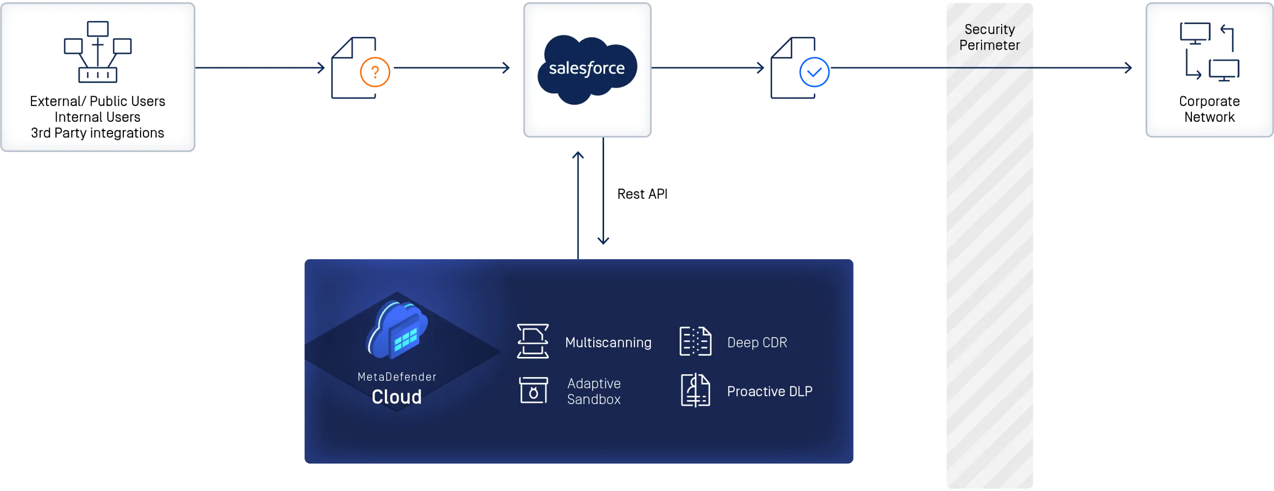 OPSWAT has partnered with Salesforce to provide Cloud Security for Salesforce, a cloud-based solution designed to complement the native security capabilities of the Salesforce platform. Our comprehensive security solution leverages OPSWAT’s MetaDefender Cloud, protecting your Salesforce infrastructure from file-borne threats.