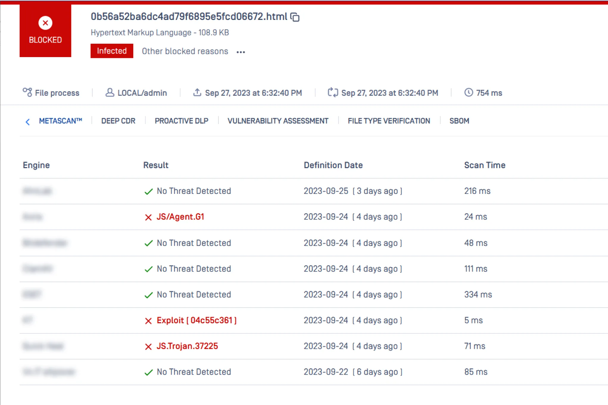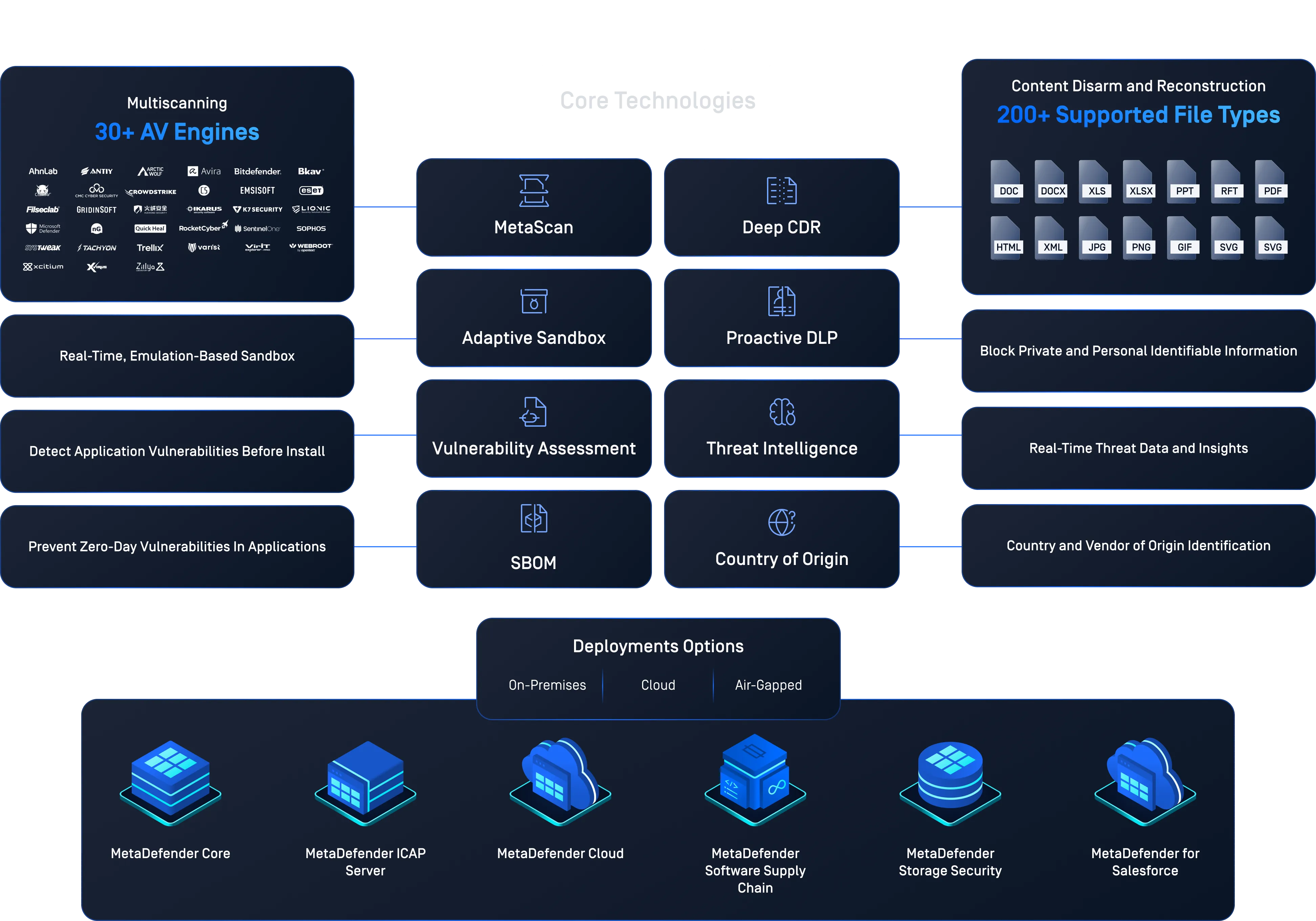 MetaDefender Multiscanning technology leverages 30+ leading anti-malware engines and proactively detects over 99% of malware by using signatures, heuristics, and machine learning. This significantly improves detection of known and unknown threats and provides the earliest protection against malware outbreaks.