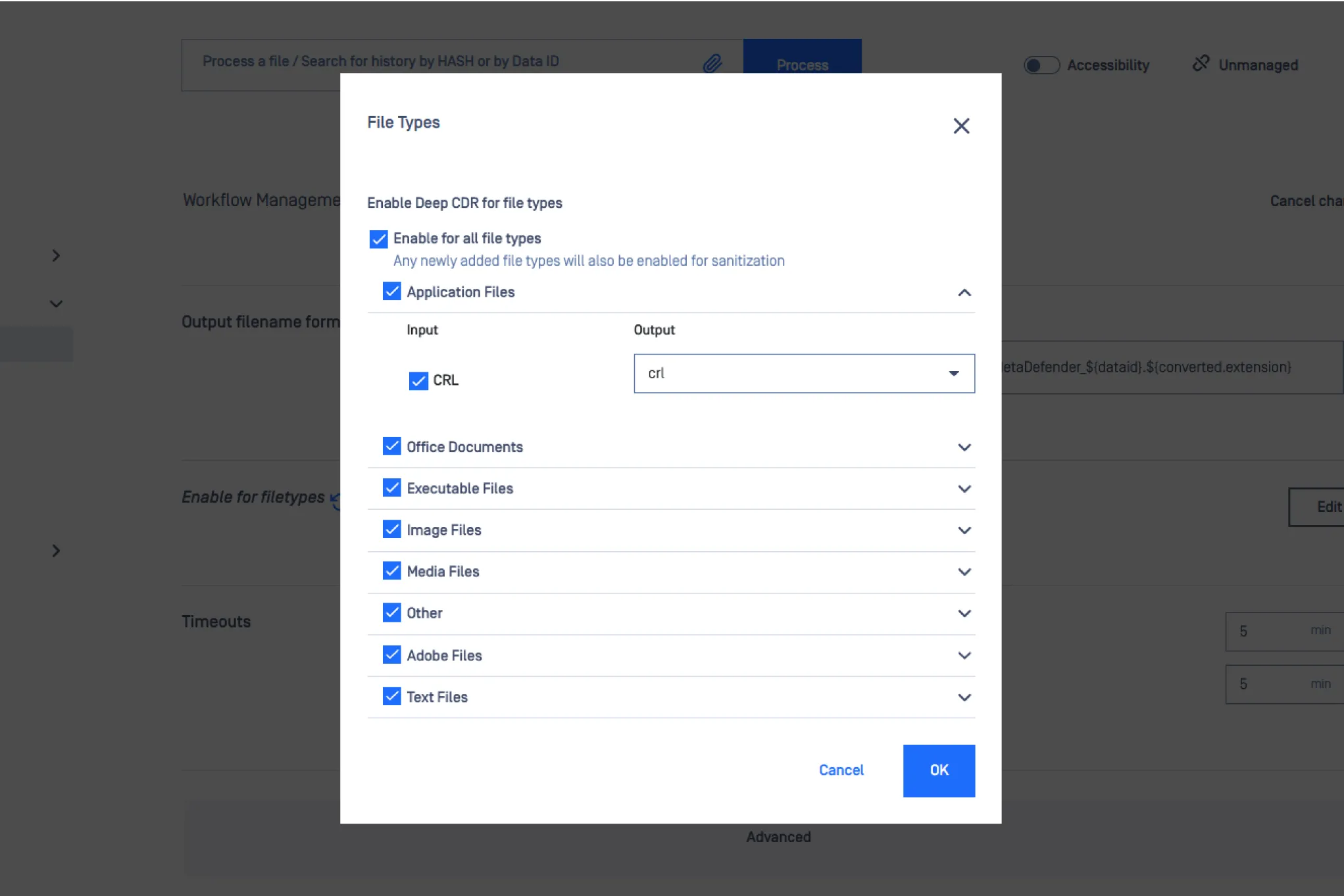 Use the file type conversion functionality to flatten files to fewer complex formats. MetaDefender enables administrators to specify that certain file types are converted to other files types (e.g. Microsoft Word documents to PDF). By adding this step to the data processing workflow, zero-day attacks where malicious objects are embedded into office documents or image files can be eliminated, even if they have the ability to evade detection by antivirus engines.