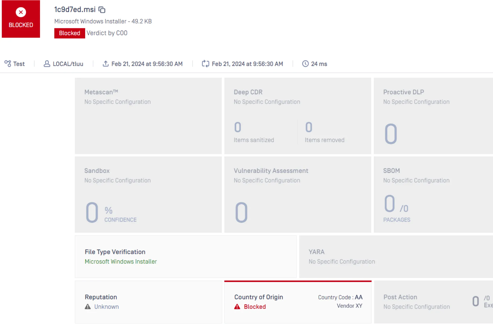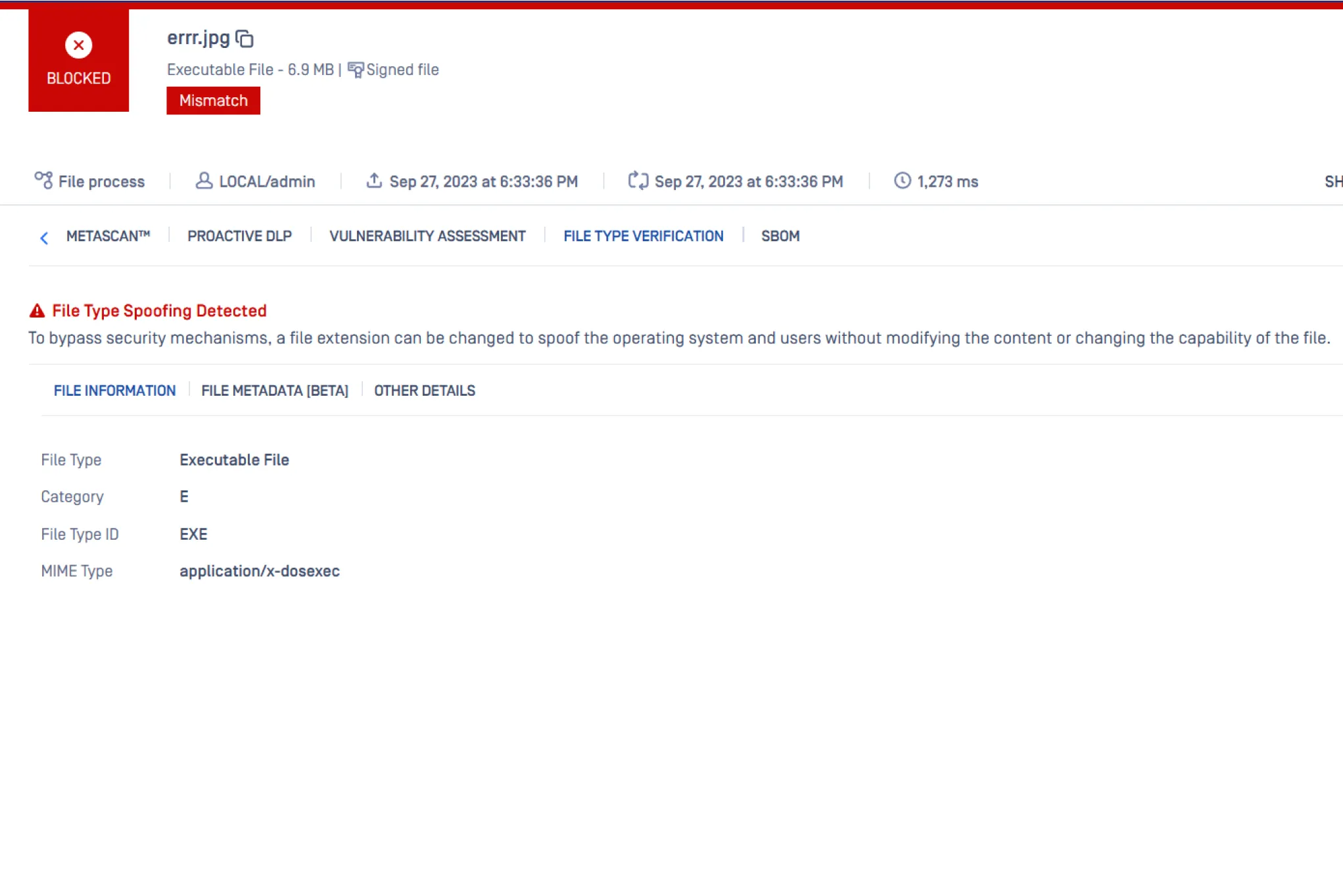 A spoofed file usually indicates malicious intent, so to mitigate this risk, MetaDefender block files with incorrect extensions. For example, MetaDefender can prevent EXE or DLL files trying to pose as TXT files from entering your organization.