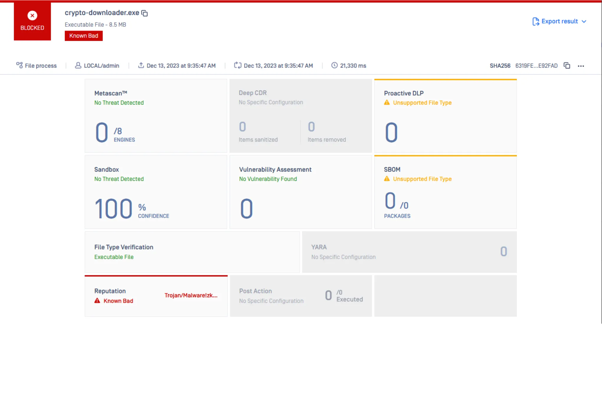 - Advanced threat detection - Identify uploaded files as “known good”, “known bad” or “unknown” by matching hashes against database of known malicious or safe files.