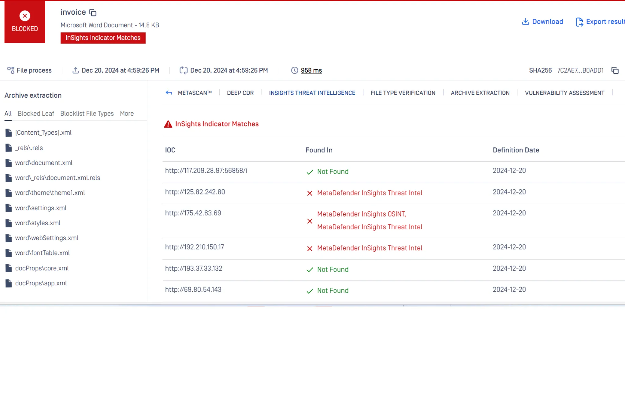 MetaDefender InSights Threat Intelligence engine detects known malicious domains and IP addresses in documents and enables real-time blocking of files based on malicious indicator detections. It applies high-quality, curated threat intelligence to extracted indicators, aggregating data from hundreds of sources to ensure the highest quality threat detection and response capabilities.