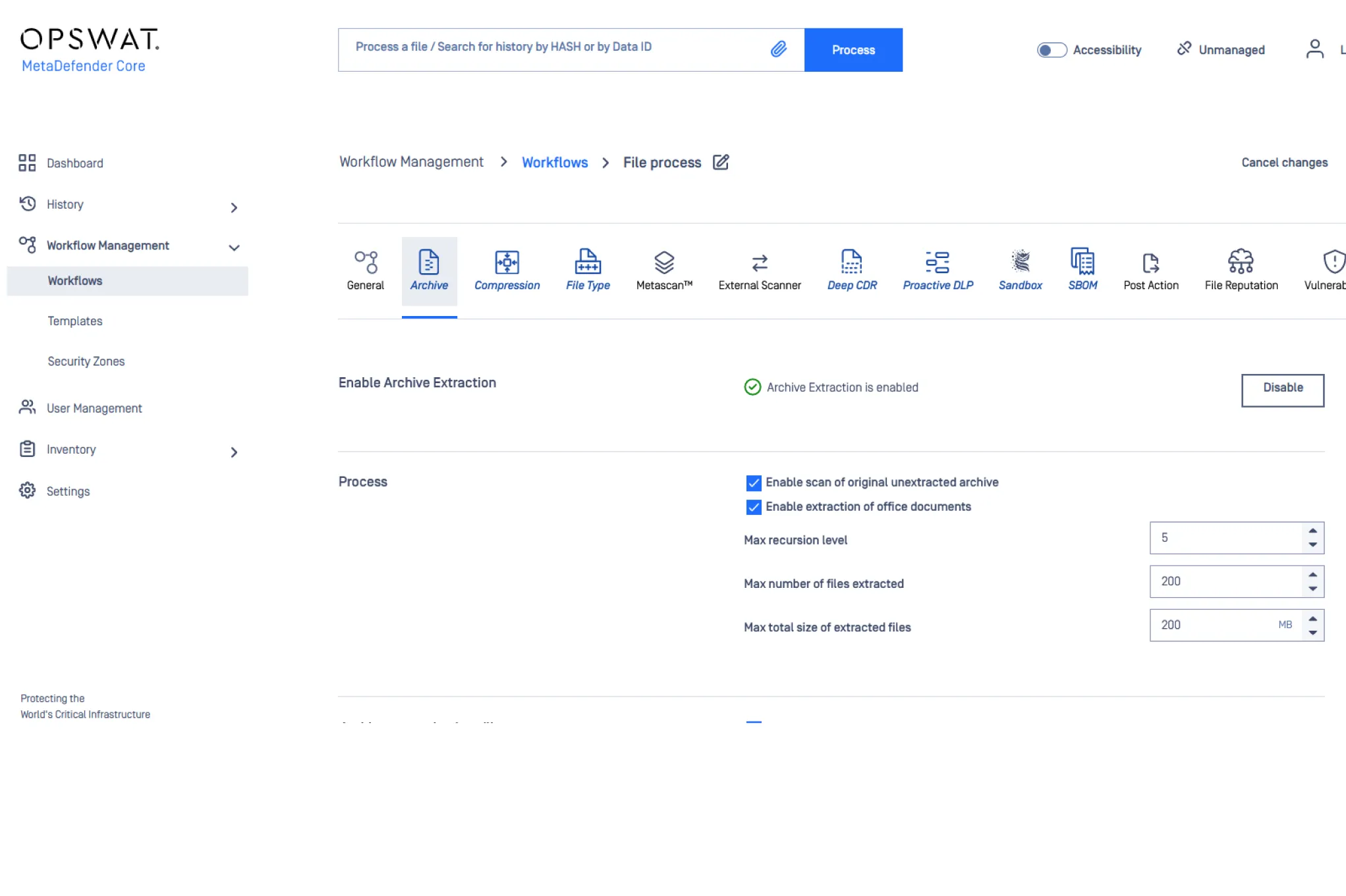 MetaDefender currently supports archive scanning for over 30 types of compressed files. Archive handling options are configurable, and encrypted archives are supported.