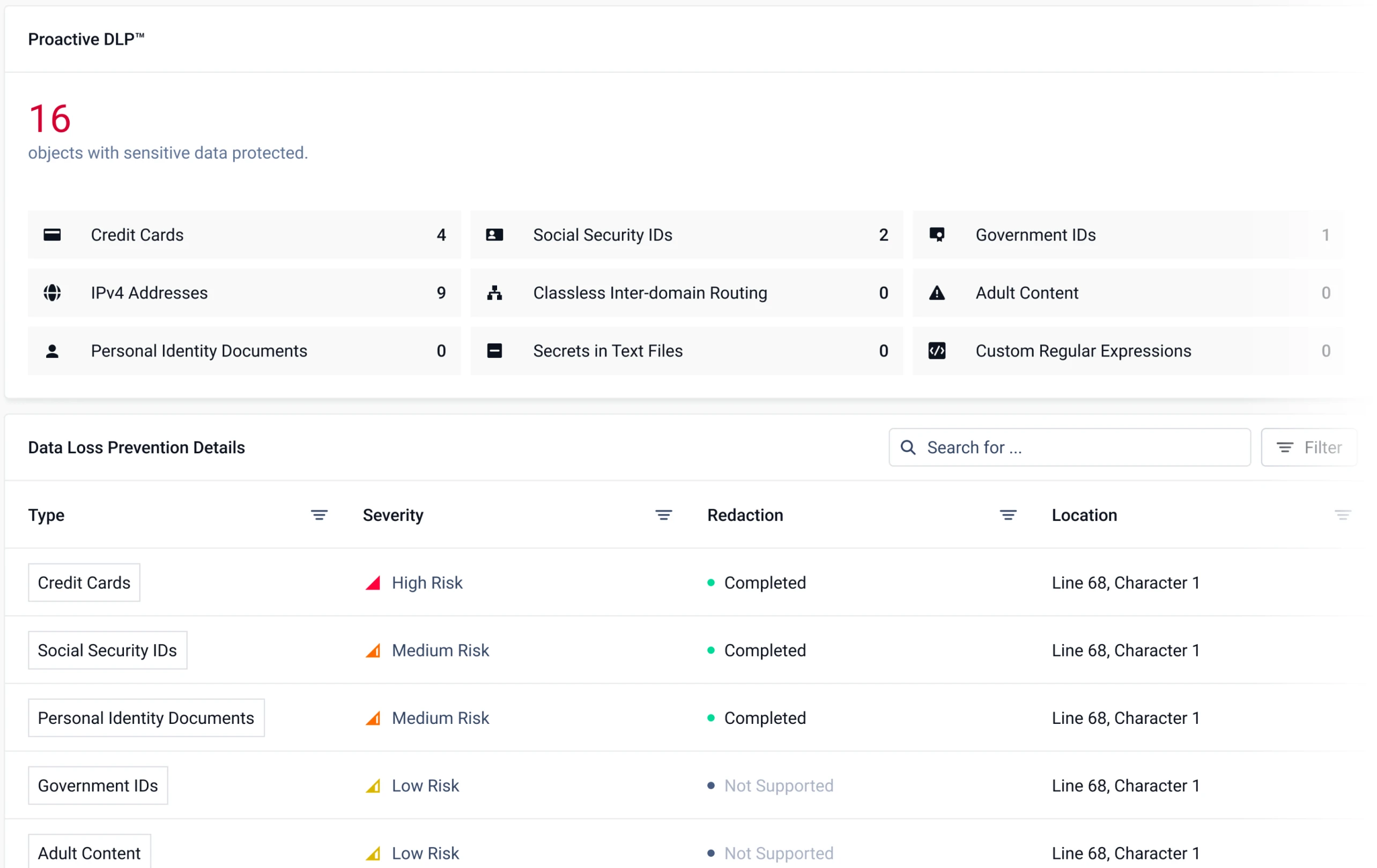 Proactive Data Loss Prevention (Proactive DLP) helps prevent potential data breaches and regulatory compliance violations by detecting and blocking sensitive data in files.