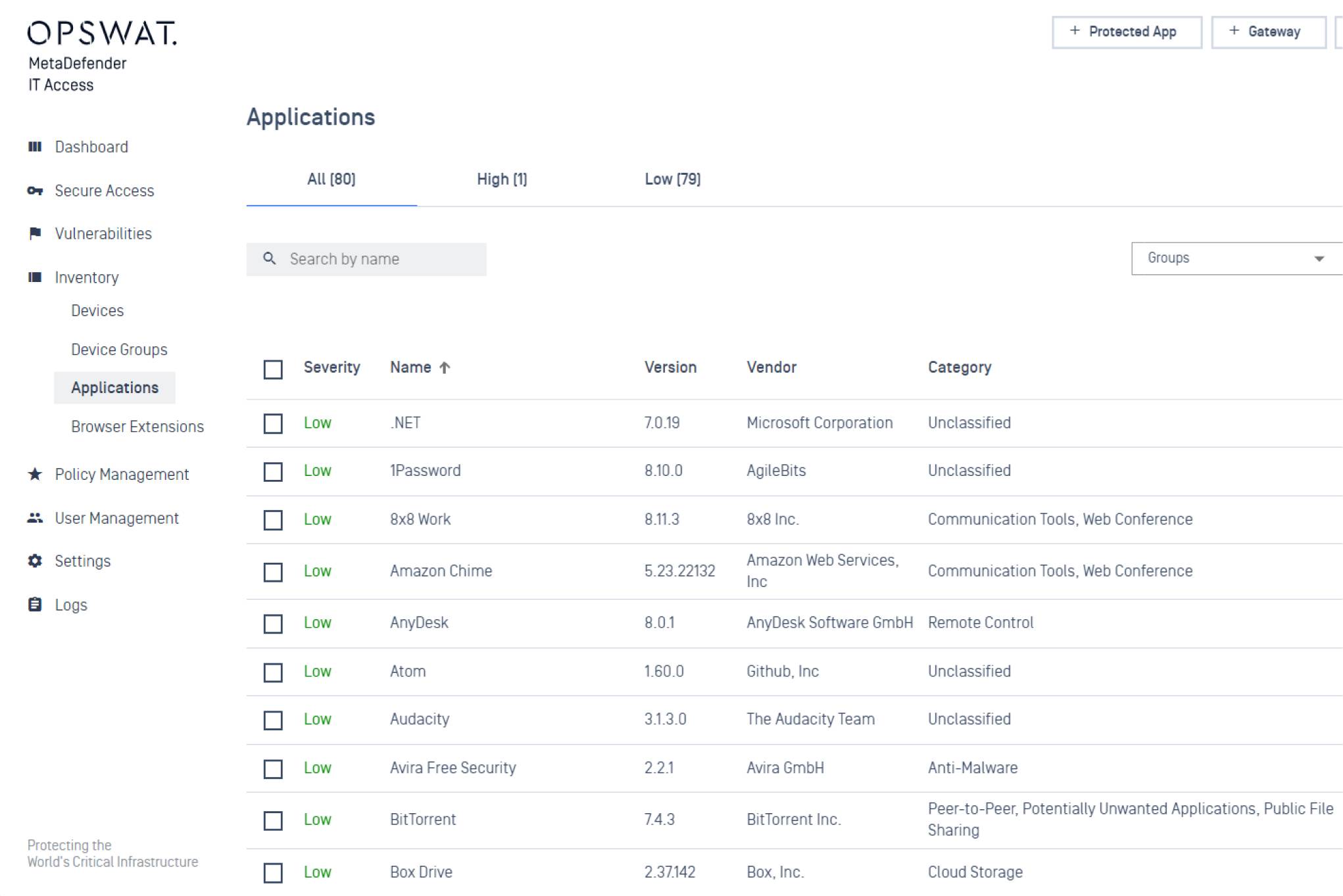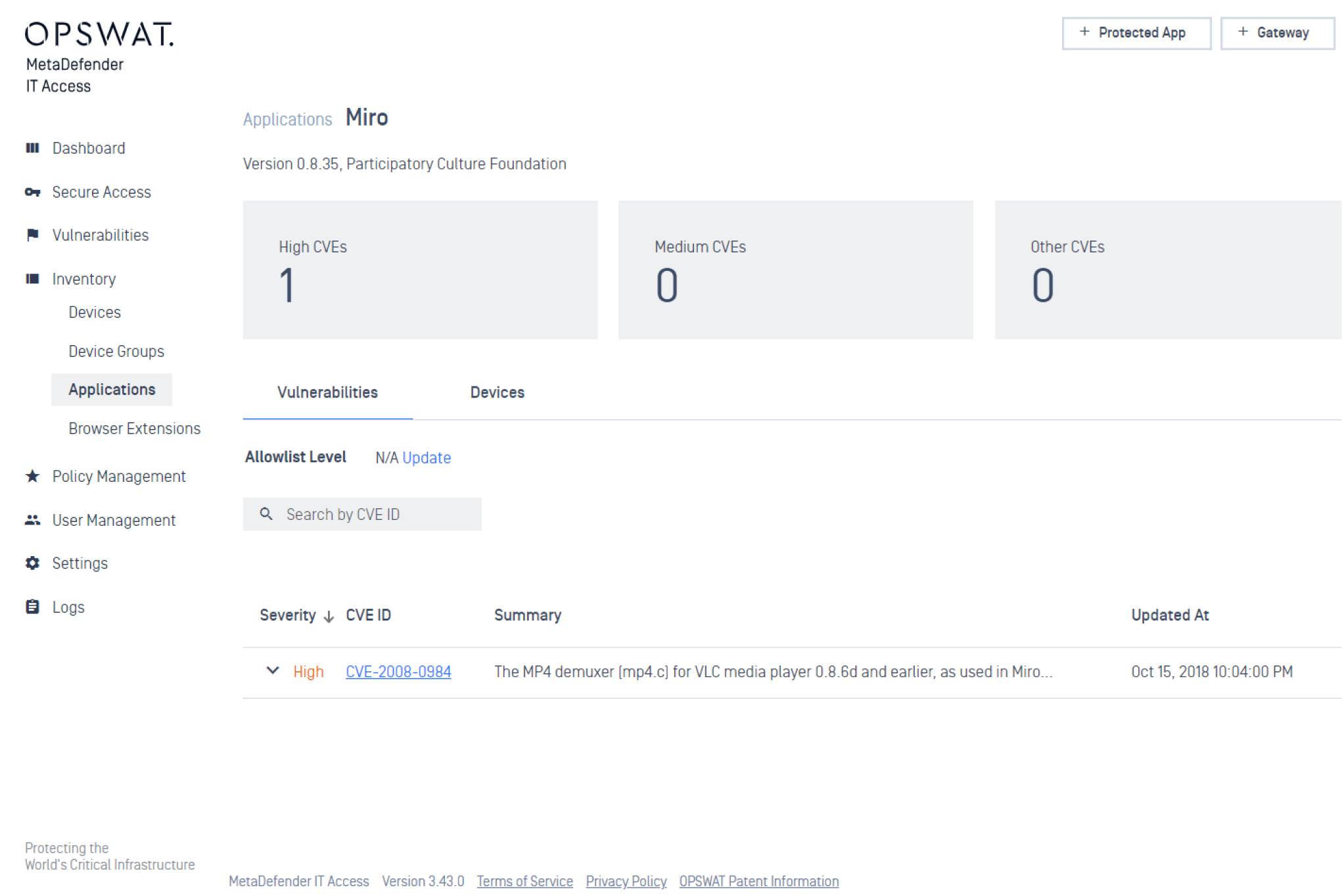MetaDefender Access can detect vulnerable applications on endpoints and deny access to vulnerable devices. Using a scoring system based on OPSWAT and CVSS scores, MetaDefender Access provides visibility into the severity of vulnerable applications installed organization-wide as well as per device and provides information on recommended remediation.