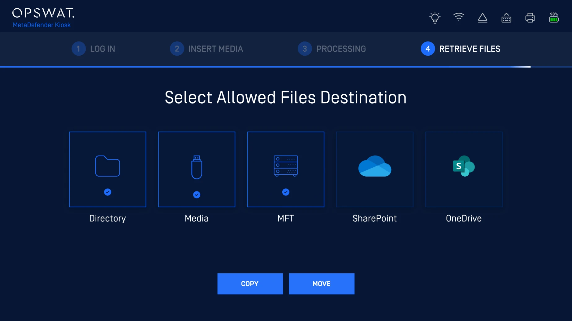 MetaDefender Kiosk can be integrated seamlessly with MetaDefender Managed File Transfer (MFT) for storing, tracking, and auditing files into a secure network. MetaDefender Kiosk to Managed File Transfer workflow creates a seamless process that simplifies the user experience in transmitting files across sensitive networks while maintaining high standards of security.