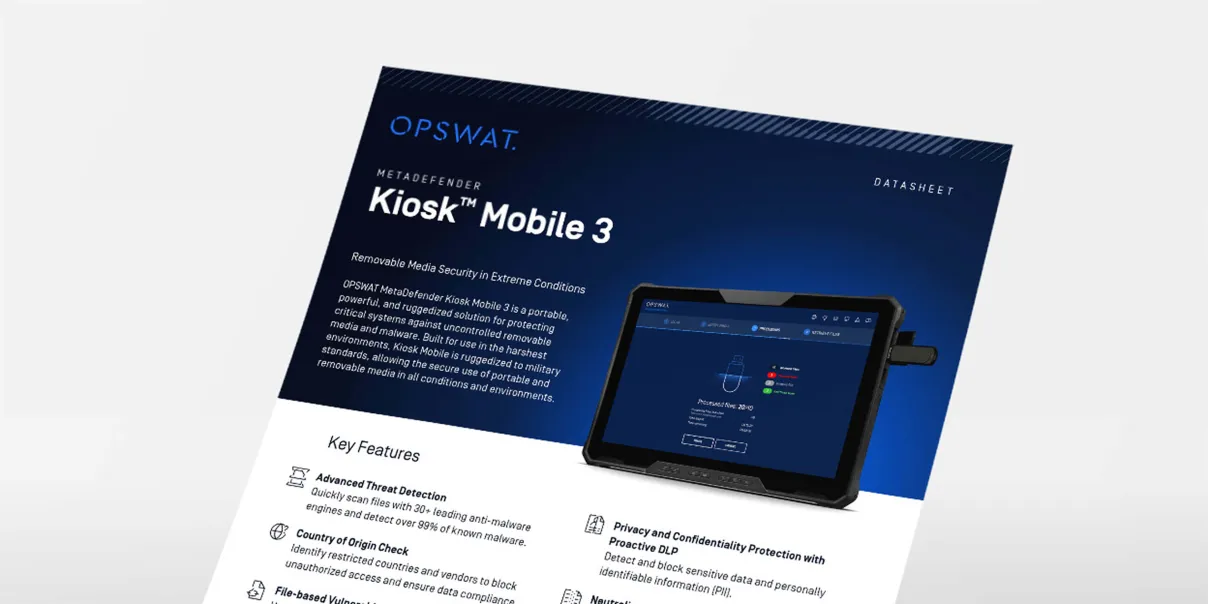 OPSWAT MetaDefender Kiosk Mobile is a portable, powerful, and ruggedized solution for protecting critical systems against uncontrolled removable media and malware.