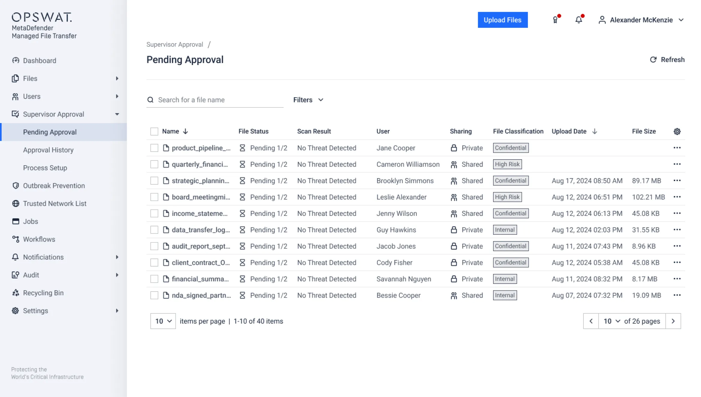 By combining advanced threat prevention with encryption, role-based access control, and supervisor approval workflows, MetaDefender MFT helps prevent malware outbreaks, data leakage, and unauthorized file movement across enterprise and critical infrastructure environments.