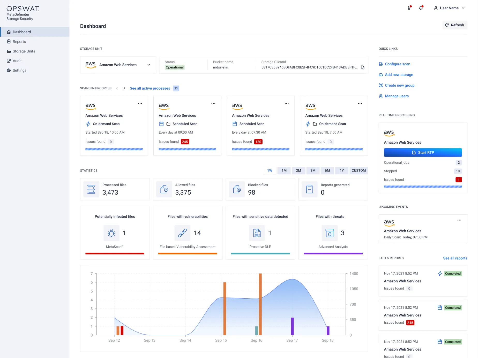 MetaDefender Storage Security helps businesses enforce data protection policies, track sensitive content, and produce actionable reports with dynamic charts, and detailed PDF audits to help meet compliance needs with confidence.