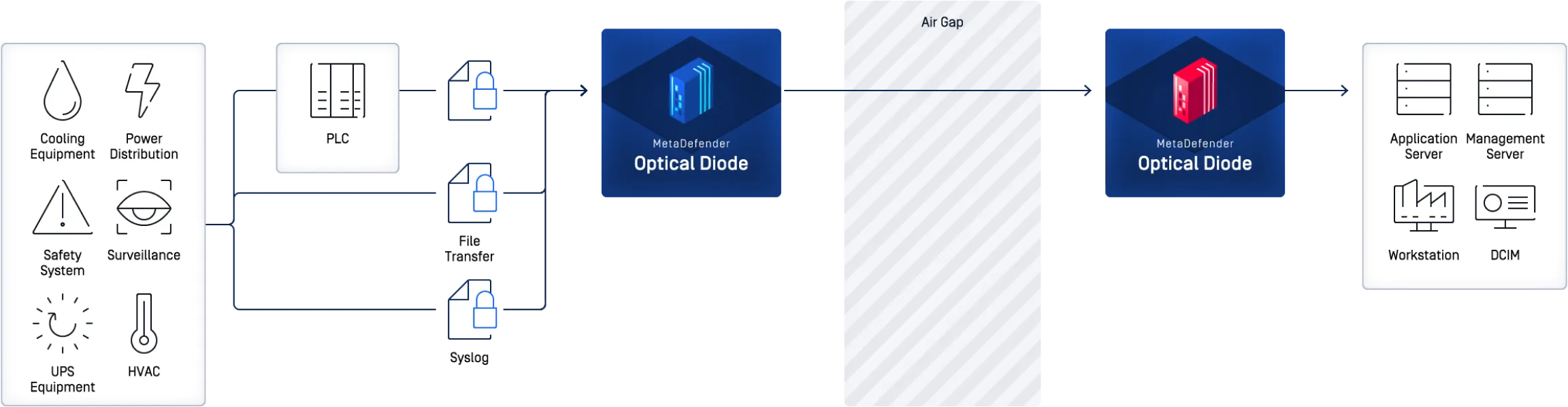MetaDefender Optical Diode securely transfers alerts and monitoring data to a central monitoring location. MetaDefender Modbus, SFTP and SMTP (email) connectors transfer data over an enforced one-way non-routable protocol break.