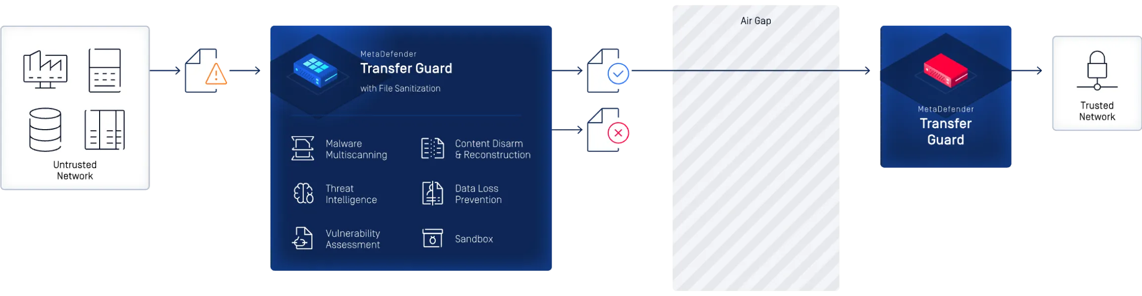 MetaDefender Transfer Guard couples the air-gap level security provided by Optical Diode with OPSWAT’s award-winning MetaDefender Core file sanitization engine ensuring files are safe to transfer.