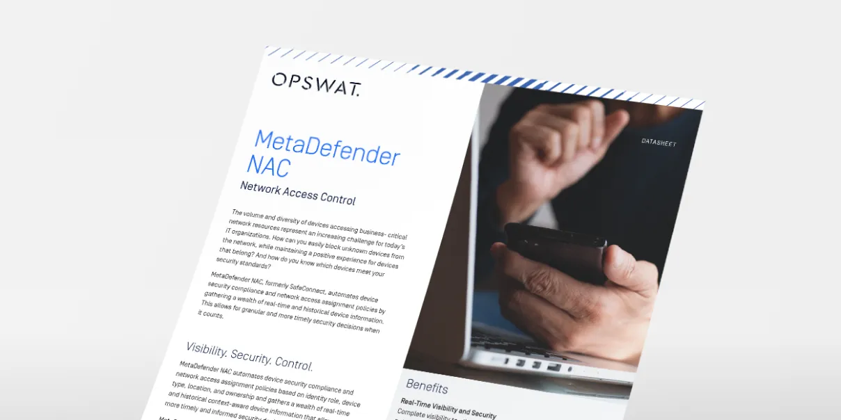 Complete visibility to every device on your network. OPSWAT gathers information from multiple sources including LDAP/Active Directory, RADIUS Accounting, DHCP, NetFlow and SFlow to supply not only the IP Address, MAC Address, User ID and Role, but also Device Type, Location and Time of Access, Ownership and compliance. This strong visibility enables authentication to ensure only approved resources can access the network.