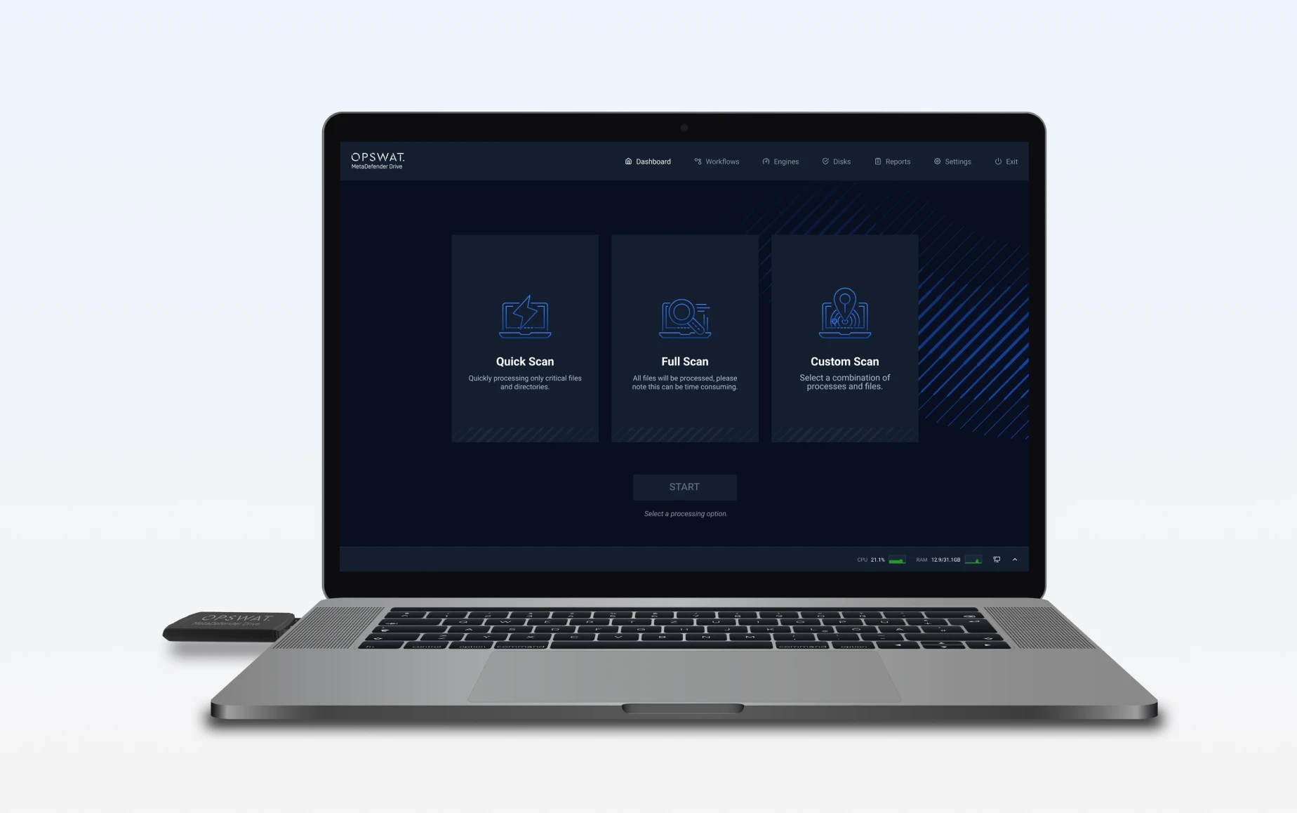 MetaDefender Drive with Smart Touch scans and ensures all hardware, from new servers to vendor laptops, is safe to use before entering your environment.