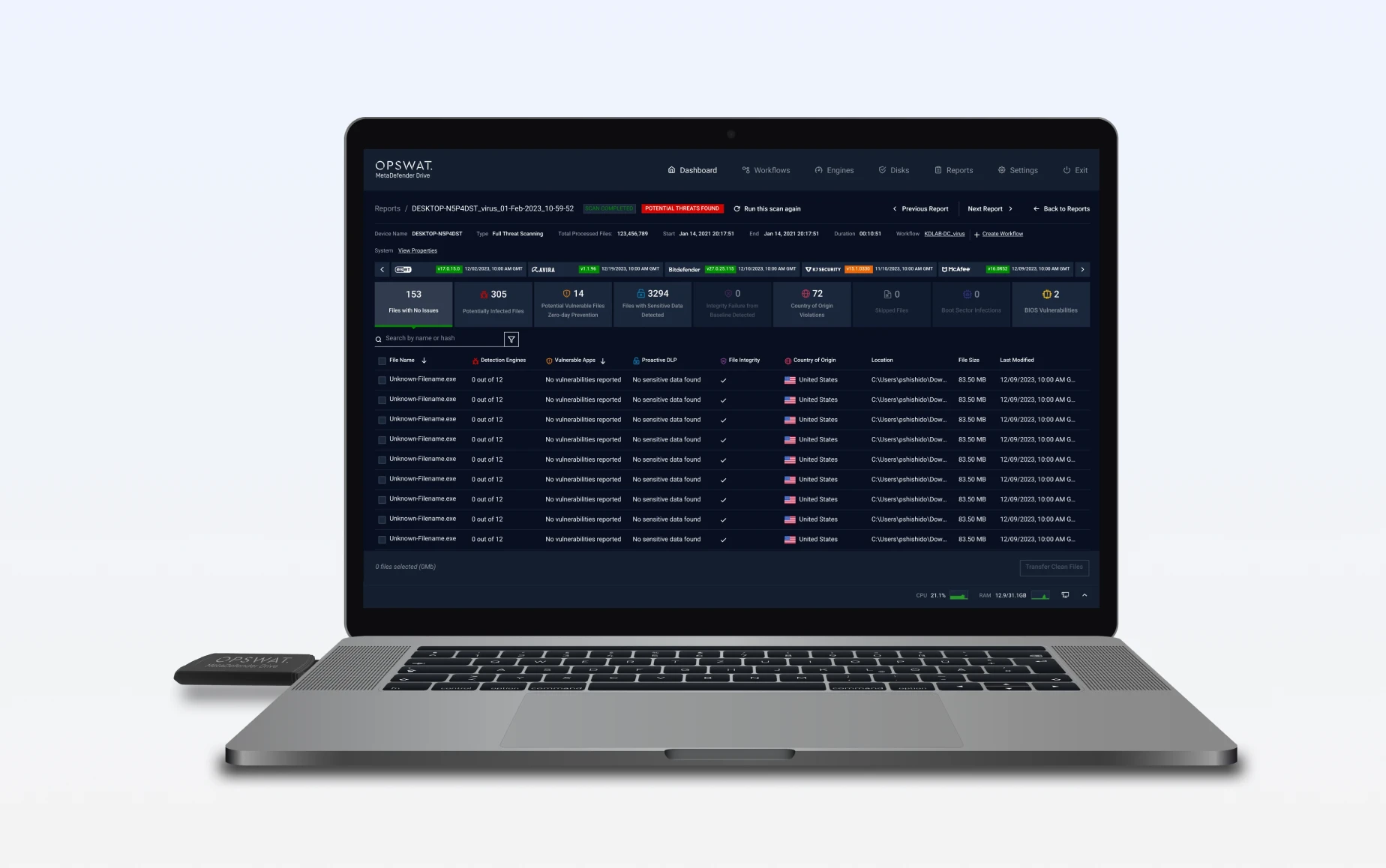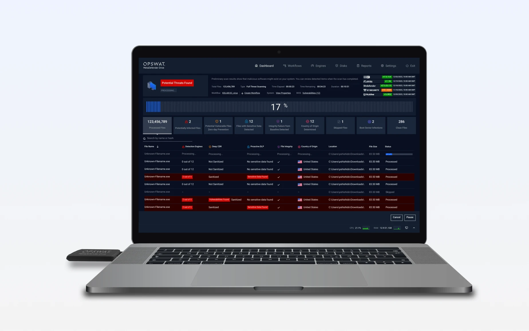 MetaDefender Drive ensures unverified devices are safe before they connect. By scanning transient laptops, desktops, and servers outside the operating system, Drive detects and removes malware, vulnerabilities, and integrity risks. Threats are eliminated, clean files are verified, and only trusted devices are allowed into secure or air-gapped environments.