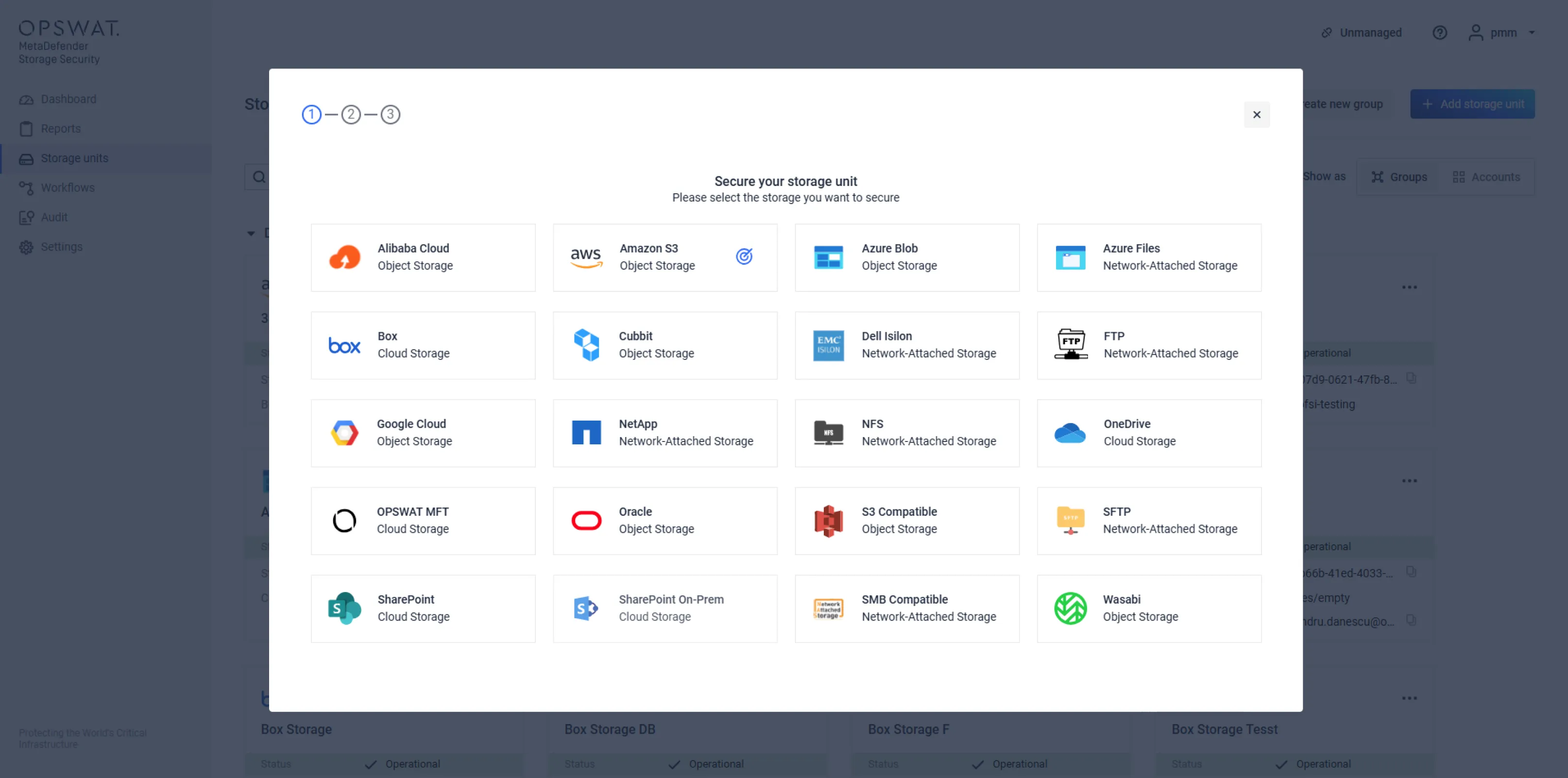 Scan files in real time or on demand across on-premises, hybrid, and cloud-native storage platforms. MetaDefender Storage Security integrates with Amazon S3, Microsoft Azure, NetApp, Wasabi, Dell EMC, SharePoint, Box, and any SMB/NFS/SFTP or S3-compatible storage for seamless workflow protection.
